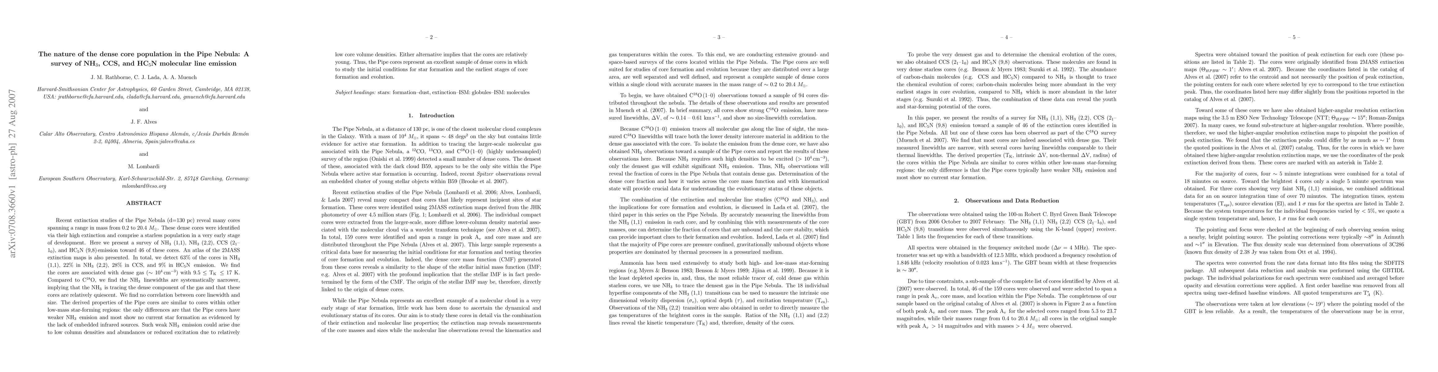 This study surveys NH3, CCS, and HC5N molecular line emissions in the Pipe Nebula's dense cores, finding that most cores show no current star formation and exhibit relatively quiescent conditions. The cores' properties suggest they are young, with low NH3 emission likely due to low column densities or reduced excitation.