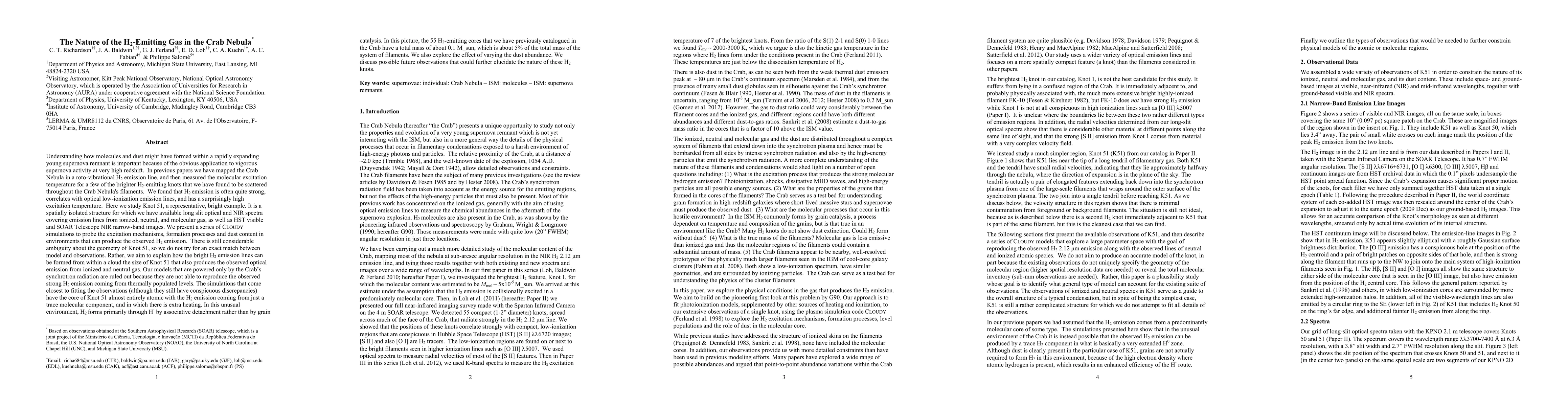Understanding how molecules and dust might have formed within a rapidly expanding young supernova remnant is important because of the obvious application to vigorous supernova activity at very high redshift. In previous papers, we found that the H2 emission is often quite strong, correlates with optical low-ionization emission lines, and has a surprisingly high excitation temperature. Here we study Knot 51, a representative, bright example, for which we have available long slit optical and NIR spectra covering emission lines from ionized, neutral, and molecular gas, as well as HST visible and SOAR Telescope NIR narrow-band images. We present a series of CLOUDY simulations to probe the excitation mechanisms, formation processes and dust content in environments that can produce the observed H2 emission. We do not try for an exact match between model and observations given Knot 51's ambiguous geometry. Rather, we aim to explain how the bright H2 emission lines can be formed from within the volume of Knot 51 that also produces the observed optical emission from ionized and neutral gas. Our models that are powered only by the Crab's synchrotron radiation are ruled out because they cannot reproduce the strong, thermal H2 emission. The simulations that come closest to fitting the observations have the core of Knot 51 almost entirely atomic with the H2 emission coming from just a trace molecular component, and in which there is extra heating. In this unusual environment, H2 forms primarily by associative detachment rather than grain catalysis. In this picture, the 55 H2-emitting cores that we have previously catalogued in the Crab have a total mass of about 0.1 M_sun, which is about 5% of the total mass of the system of filaments. We also explore the effect of varying the dust abundance. We discuss possible future observations that could further elucidate the nature of these H2 knots.