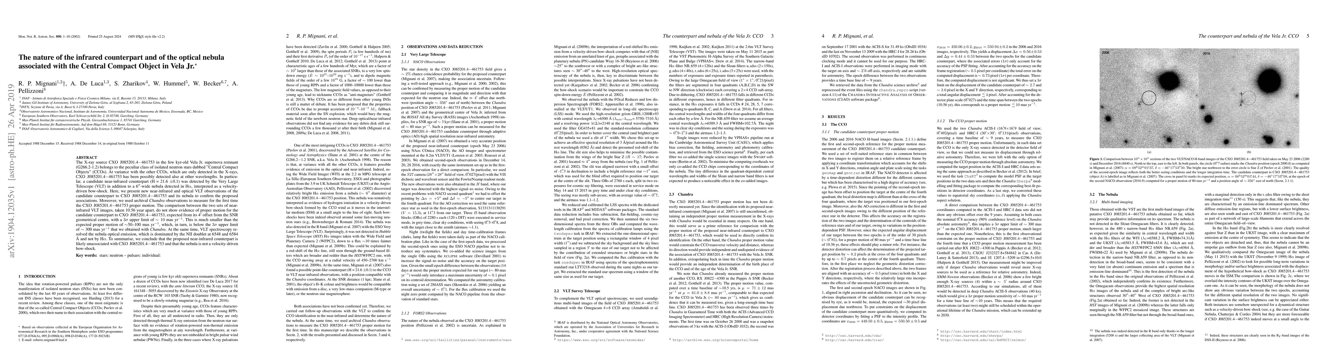 The X-ray source CXO\, J085201.4$-$461753in the few kyr-old Vela Jr. supernova remnant (G266.2-1.2) belongs to the peculiar class of isolated neutron stars dubbed "Central Compact Objects" (CCOs). At variance with the other CCOs, which are only detected in the X-rays, \cxo\ has been possibly detected also at other wavelengths. In particular, a candidate near-infrared counterpart (H = 21.6 $\pm$0.1) was detected by the Very Large Telescope (VLT) in addition to a 6\arcsec-wide nebula detected in H$\alpha$, interpreted as a velocity-driven bow-shock. Here, we present new near-infrared and optical VLT observations of the candidate counterpart to \cxo\ and its nebula to confirm the proposed associations. Moreover, we used archival Chandra observations to measure for the first time the CXO\, J085201.4$-$461753 proper motion. The comparison between the two sets of near-infrared VLT images, taken 10.56 year apart, do not show evidence of proper motion for the candidate counterpart to CXO\, J085201.4$-$461753, expected from its 4\arcmin\ offset from the SNR geometrical centre, with a $3\sigma$ upper limit of $\sim 10$ mas yr$^{-1}$. This is much smaller than the expected proper motion of $\sim$50--100 mas yr$^{-1}$, which, in turn, is below the $3\sigma$ upper limit of $\sim$ 300 mas yr$^{-1}$ that we obtained with Chandra. At the same time, VLT spectroscopy resolved the nebula optical emission, which is dominated by the NII doublet at 6548 and 6584 \AA\ and not by H$\alpha$. To summarise, we conclude that the proposed near-infrared counterpart is likely unassociated with \cxo\ and that the nebula is not a velocity-driven bow-shock.