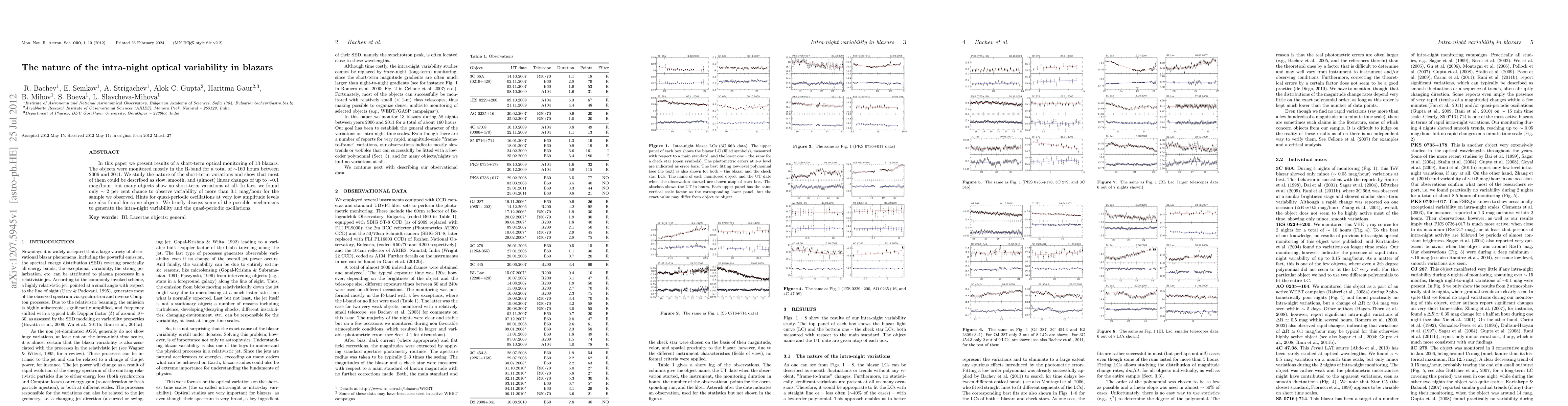 This paper reports on short-term optical monitoring of 13 blazars, revealing mostly slow, smooth, and linear variations up to ~0.1 mag/hour, with only a 2% chance of observing higher variability. The study also hints at quasi-periodic oscillations in some blazars.