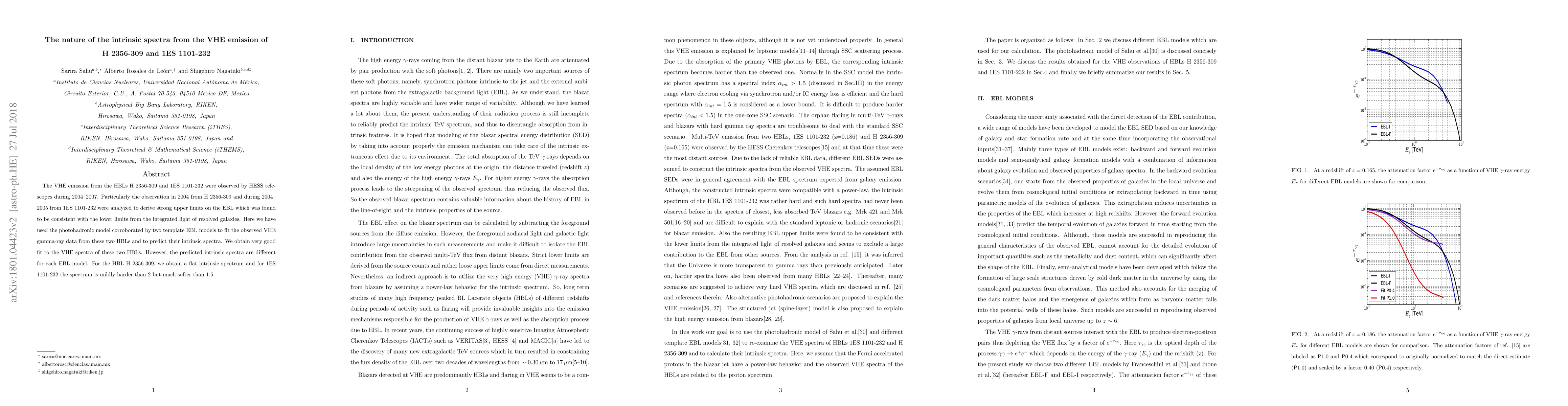 The VHE emission from the HBLs H 2356-309 and 1ES 1101-232 were observed by HESS telescopes during 2004--2007. Particularly the observation in 2004 from H 2356-309 and during 2004--2005 from 1ES 1101-232 were analyzed to derive strong upper limits on the EBL which was found to be consistent with the lower limits from the integrated light of resolved galaxies. Here we have used the photohadronic model corroborated by two template EBL models to fit the observed VHE gamma-ray data from these two HBLs and to predict their intrinsic spectra. We obtain very good fit to the VHE spectra of these two HBLs. However, the predicted intrinsic spectra are different for each EBL model. For the HBL H 2356-309, we obtain a flat intrinsic spectrum and for 1ES 1101-232 the spectrum is mildly harder than 2 but much softer than 1.5.