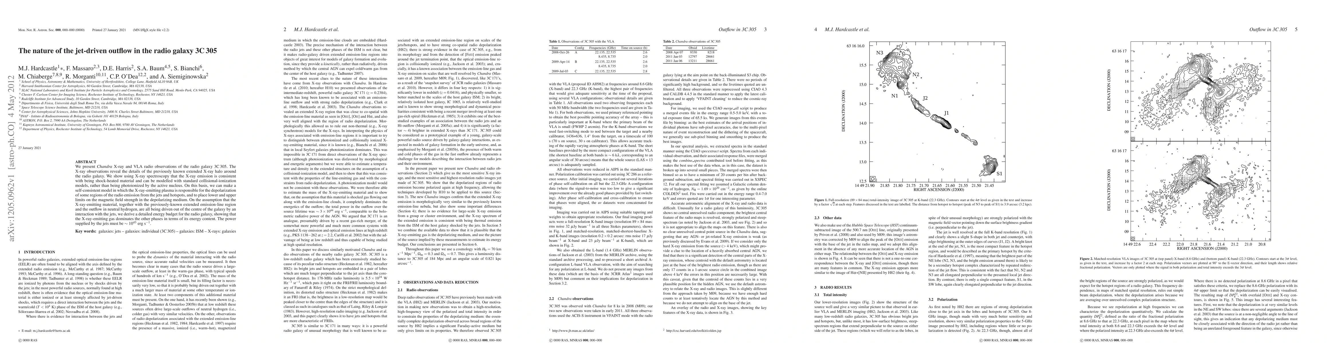 We present Chandra X-ray and VLA radio observations of the radio galaxy 3C305. The X-ray observations reveal the details of the previously known extended X-ray halo around the radio galaxy. We show using X-ray spectroscopy that the X-ray emission is consistent with being shock-heated material and can be modelled with standard collisional-ionization models, rather than being photoionized by the active nucleus. On this basis, we can make a self-consistent model in which the X-ray-emitting plasma is responsible for the depolarization of some regions of the radio emission from the jets and hotspots, and to place lower and upper limits on the magnetic field strength in the depolarizing medium. On the assumption that the X-ray-emitting material, together with the previously-known extended emission-line region and the outflow in neutral hydrogen, are all being driven out of the centre of the galaxy by an interaction with the jets, we derive a detailed energy budget for the radio galaxy, showing that the X-ray-emitting gas dominates the other phases in terms of its energy content. The power supplied by the jets must be ~ 10^43 erg/s.