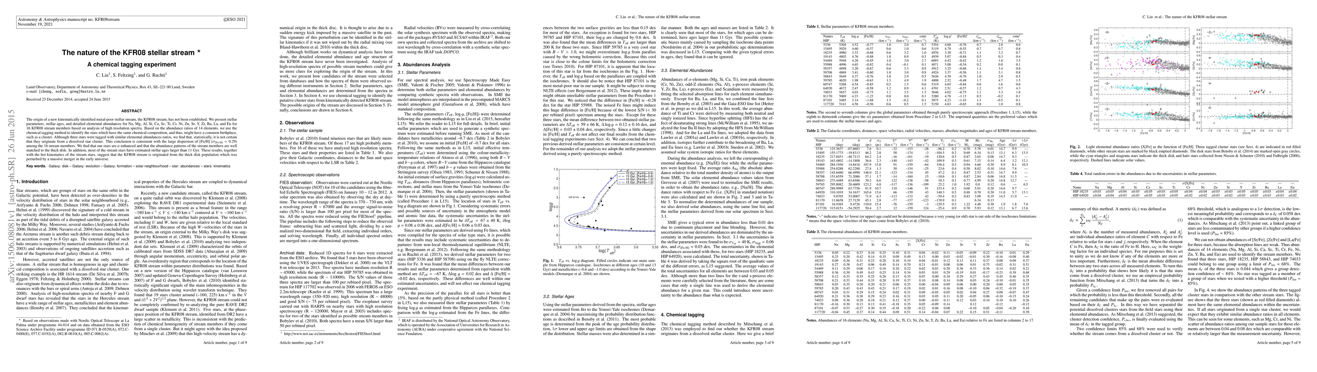 The research examines the KFR08 stellar stream, finding its members are alpha-enhanced and have abundance patterns matching the thick disk. Despite some stars sharing similar element ratios, indicating a possible common origin, the large [Fe/H] dispersion suggests the stream likely originated from perturbations to the thick disk in the early universe, possibly due to a massive merger event.