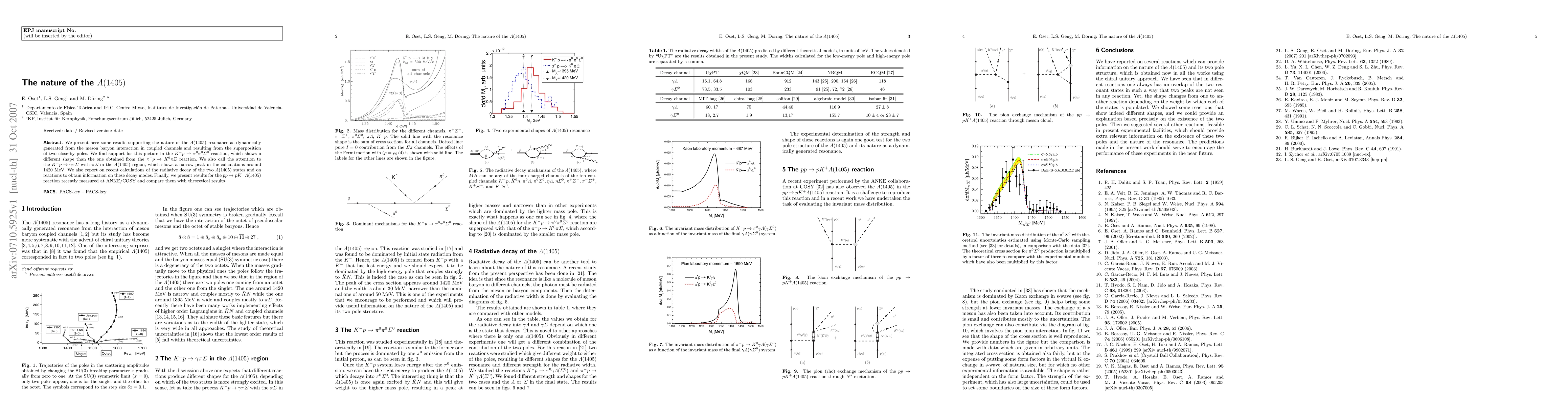 We present here some results supporting the nature of the $\Lambda(1405)$ resonance as dynamically generated from the meson baryon interaction in coupled channels and resulting from the superposition of two close-by poles. We find support for this picture in the $K^- p \to \pi^0 \pi^0 \Sigma^0 $ reaction, which shows a different shape than the one obtained from the $\pi ^- p \to K^0 \pi \Sigma $ reaction. We also call the attention to the $K^- p \to \gamma \pi \Sigma$ with $\pi \Sigma$ in the $\Lambda(1405)$ region, which shows a narrow peak in the calculations around 1420 MeV. We also report on recent calculations of the radiative decay of the two $\Lambda(1405)$ states and on reactions to obtain information on these decay modes. Finally, we present results for the $pp\to p K^+\Lambda(1405)$ reaction recently measured at ANKE/COSY and compare them with theoretical results.