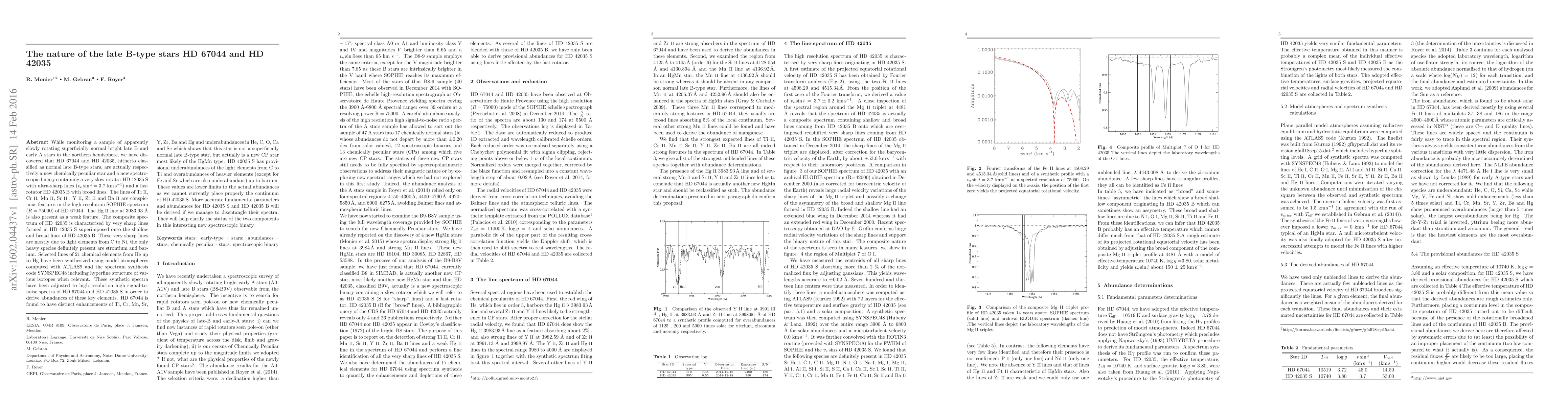 While monitoring a sample of apparently slowly rotating superficially normal bright late B and early A stars in the northern hemisphere, we have discovered that HD 67044 and HD 42035, hitherto classified as normal late B-type stars, are actually respectively a new chemically peculiar star and a new spectroscopic binary containing a very slow rotator HD 42035 S with ultra-sharp lines (vsini = 3.7 km/s) and a fast rotator HD 42035 B with broad lines. The lines of Ti, Cr, Mn, Sr, Y, Zr and Ba are conspicuous features in the high resolution SOPHIE spectrum of HD 67044. The HgII line at 3983.93 A is also present as a weak feature. The composite spectrum of HD 42035 is characterised by very sharp lines formed in HD 42035 S superimposed onto the shallow and broad lines of HD 42035 B. These very sharp lines are mostly due to light elements from C to Ni, the only heavy species definitely present are Sr and Ba. Selected lines of 21 chemical elements from He up to Hg have been synthesized using model atmospheres computed with ATLAS9 and the spectrum synthesis code SYNSPEC48 including hyperfine structure of various isotopes when relevant. Abundances of these key elements have been derived HD 67044 and HD 42035 S. HD 67044 is found to have distinct enhancements of Ti, Cr, Mn, Sr, Y, Zr, Ba and Hg and underabundances in He, C, O, Ca and Sc which shows that this star is not a superficially normal late B-type star, but actually is a new CP star most likely of the HgMn type. HD 42035 S has provisional underabundances of the light elements from C to Ti and overabundances of heavier elements up to barium. More accurate fundamental parameters and abundances for HD 42035 S and HD 42035 B will be derived if we manage to disentangle their spectra. They will help clarify the status of the two components in this interesting new spectroscopic binary.