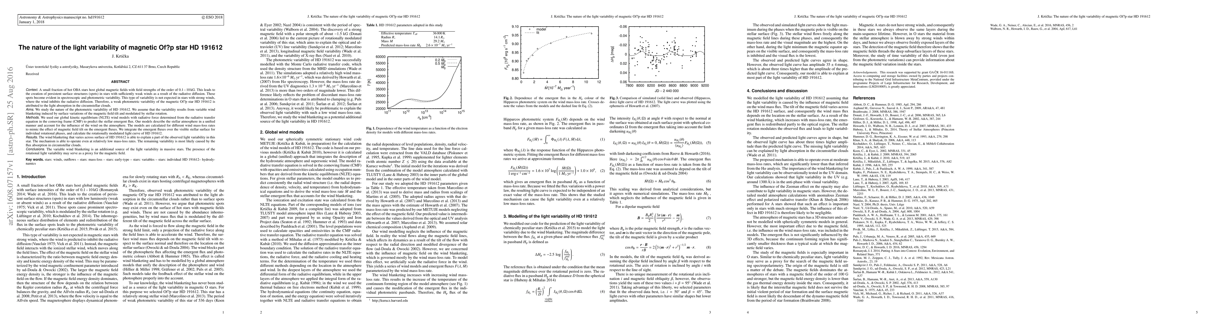 A small fraction of hot OBA stars host global magnetic fields with field strengths of the order of 0.1-10 kG. This leads to the creation of persistent surface structures (spots) in stars with sufficiently weak winds as a result of the radiative diffusion. These spots become evident in spectroscopic and photometric variability. This type of variability is not expected in stars with strong winds, where the wind inhibits the radiative diffusion. Therefore, a weak photometric variability of the magnetic Of?p star HD 191612 is attributed to the light absorption in the circumstellar clouds. We study the nature of the photometric variability of HD 191612. We assume that the variability results from variable wind blanketing induced by surface variations of the magnetic field tilt and modulated by stellar rotation. We used our global kinetic equilibrium (NLTE) wind models with radiative force determined from the radiative transfer equation in the comoving frame (CMF) to predict the stellar emergent flux. Our models describe the stellar atmosphere in a unified manner and account for the influence of the wind on the atmosphere. The models are calculated for different wind mass-loss rates to mimic the effect of magnetic field tilt on the emergent fluxes. We integrate the emergent fluxes over the visible stellar surface for individual rotational phases, and calculate the rotationally modulated light curve of HD 191612. The wind blanketing that varies across surface is able to explain a part of the observed light variability in this star. The mechanism is able to operate even at relatively low mass-loss rates. The remaining variability is most likely caused by the flux absorption in circumstellar clouds. The variable wind blanketing is an additional source of the light variability in massive stars. The presence of the rotational light variability may serve as a proxy for the magnetic field.