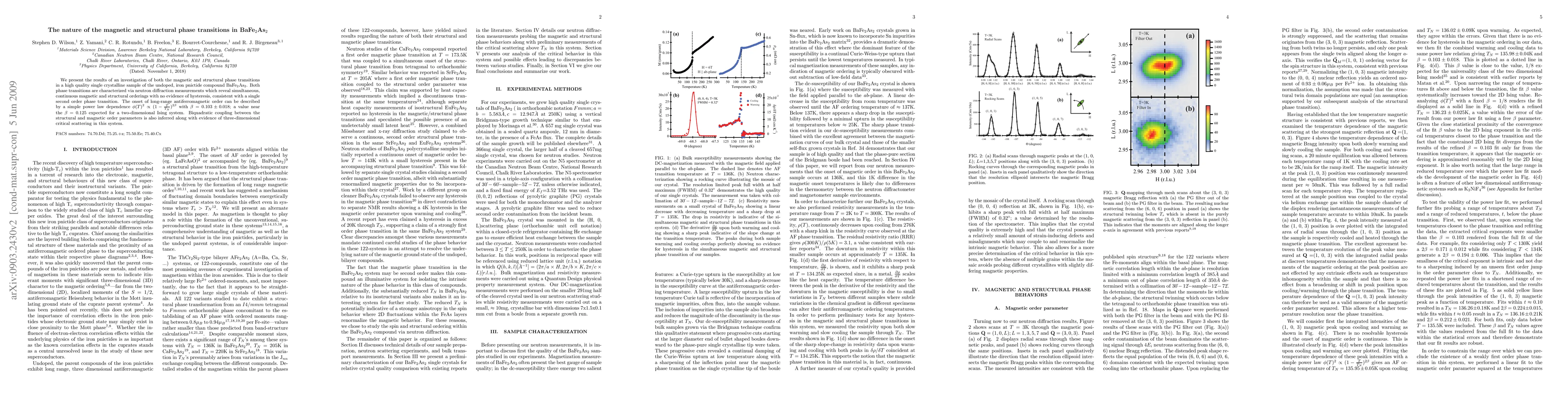 We present the results of an investigation of both the magnetic and structural phase transitions in a high quality single crystalline sample of the undoped, iron pnictide compound BaFe$_2$As$_2$. Both phase transitions are characterized via neutron diffraction measurements which reveal simultaneous, continuous magnetic and structural orderings with no evidence of hysteresis, consistent with a single second order phase transition. The onset of long-range antiferromagnetic order can be described by a simple power law dependence $\phi(T)^2\propto(1-\frac{T}{T_N})^{2\beta}$ with $\beta=0.103\pm0.018$; a value near the $\beta=0.125$ expected for a two-dimensional Ising system. Biquadratic coupling between the structural and magnetic order parameters is also inferred along with evidence of three-dimensional critical scattering in this system.