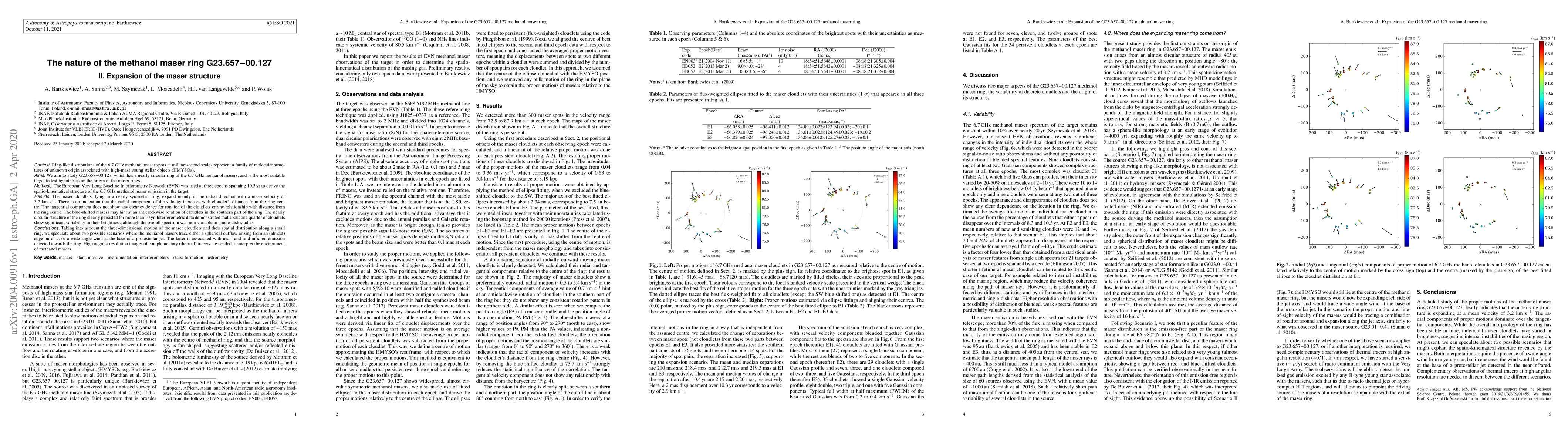 Ring-like distributions of the 6.7 GHz methanol maser spots at milliarcsecond scales represent a family of molecular structures of unknown origin associated with high-mass young stellar objects (HMYSOs). We aim to study G23.657-00.127, which has a nearly circular ring of the 6.7 GHz methanol masers, and is the most suitable target to test hypotheses on the origin of the maser rings. The European Very Long Baseline Interferometry Network (EVN) was used at three epochs spanning 10.3 yr to derive the spatio-kinematical structure of the 6.7 GHz methanol maser emission in the target. The maser cloudlets, lying in a nearly symmetric ring, expand mainly in the radial direction with a mean velocity of 3.2 km s$^{-1}$. There is an indication that the radial component of the velocity increases with cloudlet's distance from the ring centre. The tangential component does not show any clear evidence for rotation of the cloudlets or any relationship with distance from the ring centre. The blue-shifted masers may hint at an anticlockwise rotation of cloudlets in the southern part of the ring. The nearly circular structure of the ring clearly persisted for more than 10 yr. Interferometric data demonstrated that about one quarter of cloudlets show significant variability in their brightness, although the overall spectrum was non-variable in single-dish studies. Taking into account the three-dimensional motion of the maser cloudlets and their spatial distribution along a small ring, we speculate about two possible scenarios where the methanol masers trace either a spherical outflow arising from an (almost) edge-on disc, or a wide angle wind at the base of a protostellar jet. The latter is associated with near- and mid-infrared emission detected towards the ring. High angular resolution images of complementary (thermal) tracers are needed to interpret the environment of methanol masers.