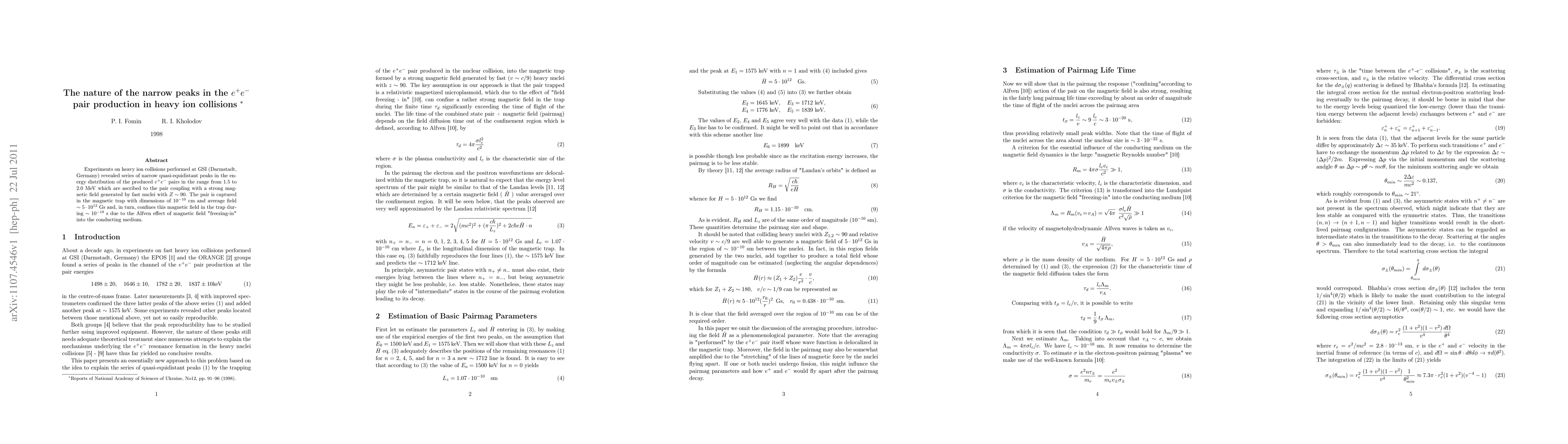 Experiments on heavy ion collisions performed at GSI (Darmstadt, Germany) revealed series of narrow quasi-equidistant peaks in the energy distribution of the produced $e^+e^-$ pairs in the range from 1.5 to 2.0 MeV which are ascribed to the pair coupling with a strong magnetic field generated by fast nuclei with $Z\sim90$. The pair is captured in the magnetic trap with dimensions of $10^{-10}$ cm and average field $\sim 5 \cdot 10^{12}$ Gs and, in turn, confines this magnetic field in the trap during $\sim 10^{-19}$ s due to the Alfven effect of magnetic field "freezing-in" into the conducting medium.