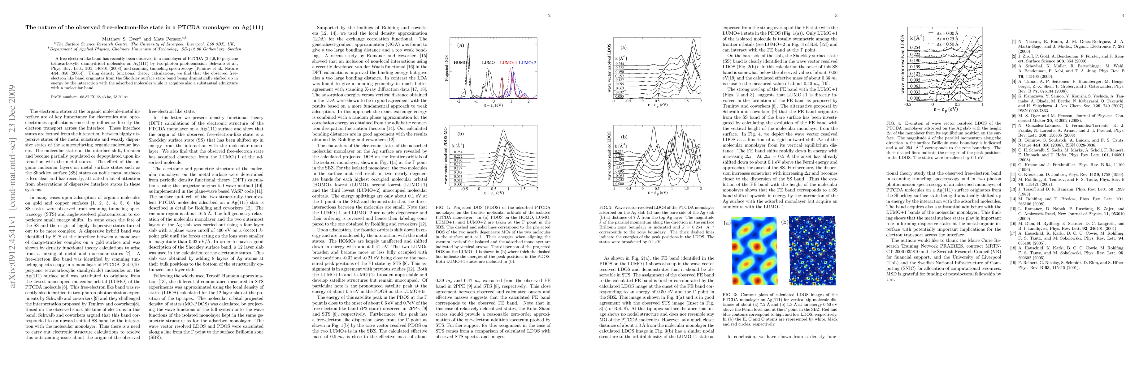 A free-electron like band has recently been observed in a monolayer of PTCDA (3,4,9,10-perylene tetracarboxylic dianhydride) molecules on Ag(111) by two-photon photoemission [Schwalb et al., Phys. Rev. Lett. 101, 146801 (2008)] and scanning tunneling spectroscopy [Temirov et al., Nature 444, 350 (2006)]. Using density functional theory calculations, we find that the observed free-electron like band originates from the Shockley surface state band being dramatically shifted up in energy by the interaction with the adsorbed molecules while it acquires also a substantial admixture with a molecular band.