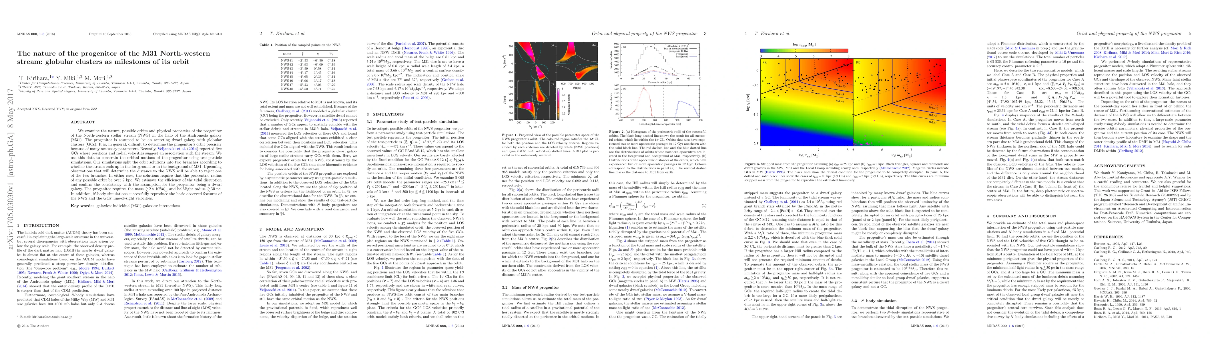 This paper investigates the nature and orbit of the progenitor of M31's North-western stream, proposing it to be an accreting dwarf galaxy with associated globular clusters. Using recent data and test-particle simulations, the study finds that the progenitor's orbit requires a pericentric radius over 2 kpc and confirms the consistency of its tidal disruption efficiency with a dwarf galaxy assumption.
