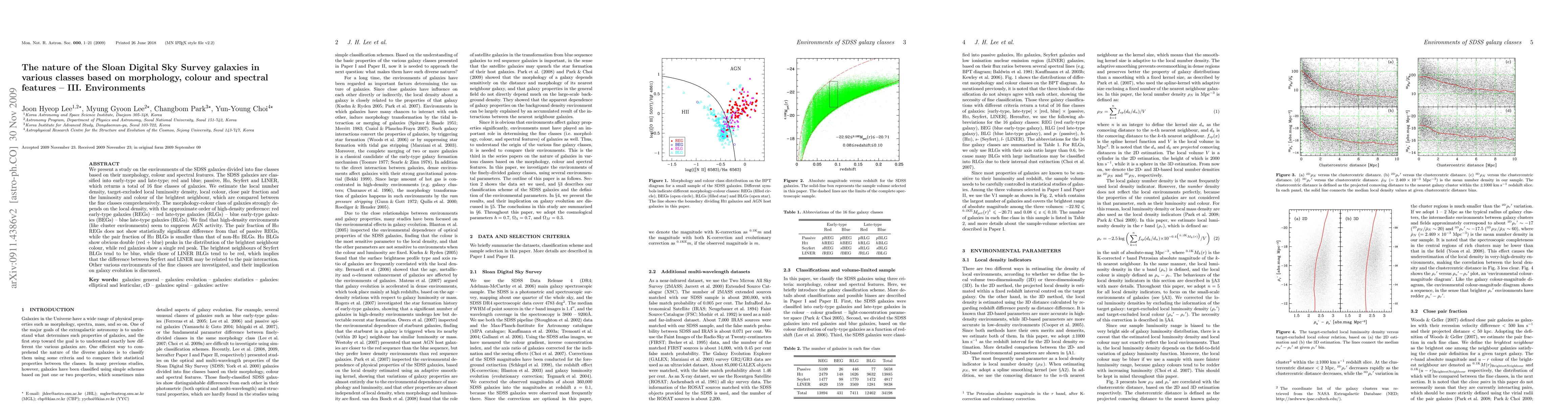This study analyzes the environments of Sloan Digital Sky Survey (SDSS) galaxies categorized into 16 fine classes based on morphology, color, and spectral features. The research finds that galaxy morphology-color class is strongly influenced by local density, with red early-type galaxies showing a preference for high-density environments, and suggests that such environments suppress AGN activity.