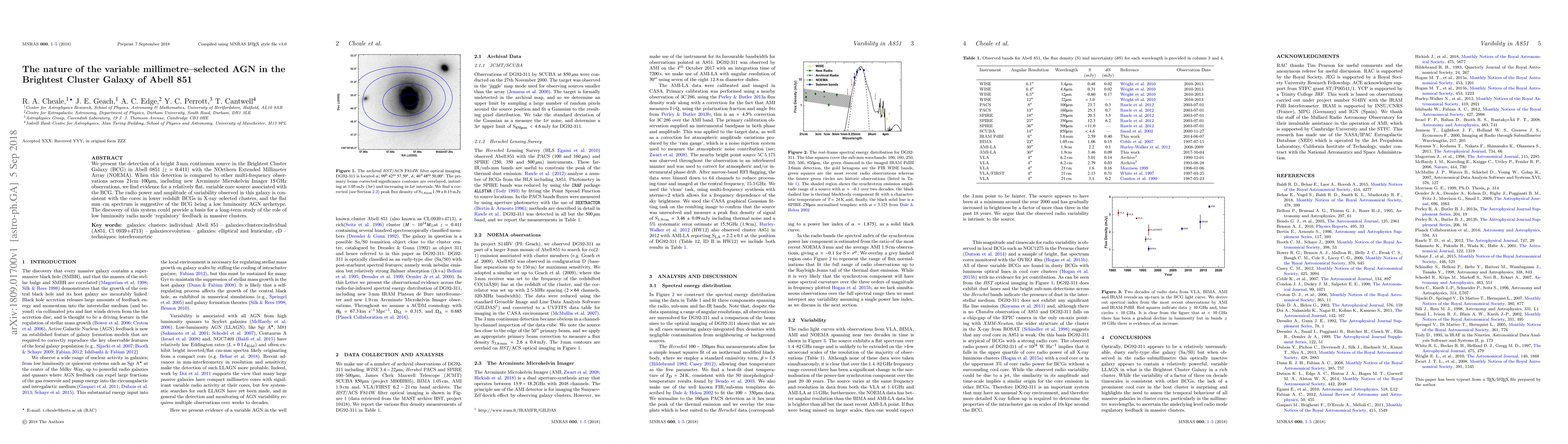 We present the detection of a bright 3mm continuum source in the Brightest Cluster Galaxy (BCG) in Abell 851 (z=0.411) with the NOrthern Extended Millimeter Array (NOEMA). When this detection is compared to other multi-frequency observations across 21cm-100um, including new Arcminute Microkelvin Imager 15GHz observations, we find evidence for a relatively flat, variable core source associated with the BCG. The radio power and amplitude of variability observed in this galaxy is consistent with the cores in lower redshift BCGs in X-ray-selected clusters, and the flat mm-cm spectrum is suggestive of the BCG being a low luminosity AGN archetype. The discovery of this system could provide a basis for a long-term study of the role of low luminosity radio mode 'regulatory' feedback in massive clusters.