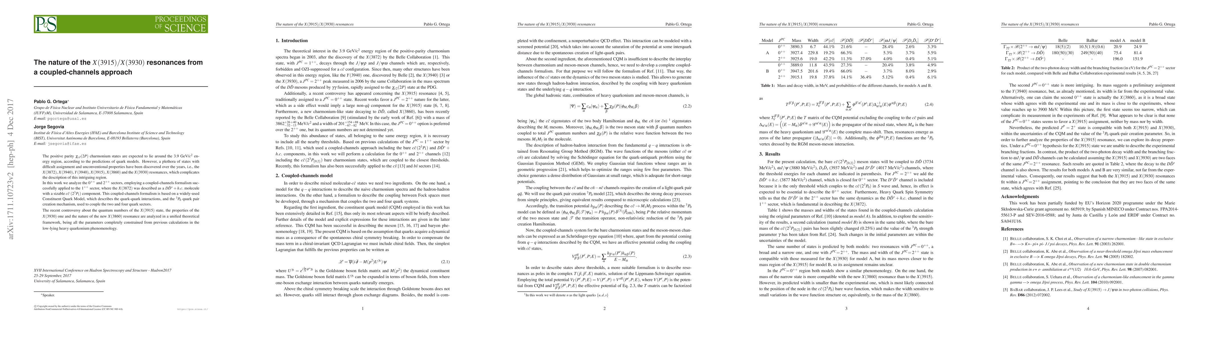 This paper investigates the nature of the $X(3915)$ and $X(3930)$ resonances using a coupled-channels approach based on the $^3P_0$ quark pair creation mechanism and a Constituent Quark Model. It aims to resolve the ongoing debate about their quantum numbers and properties within a unified theoretical framework.