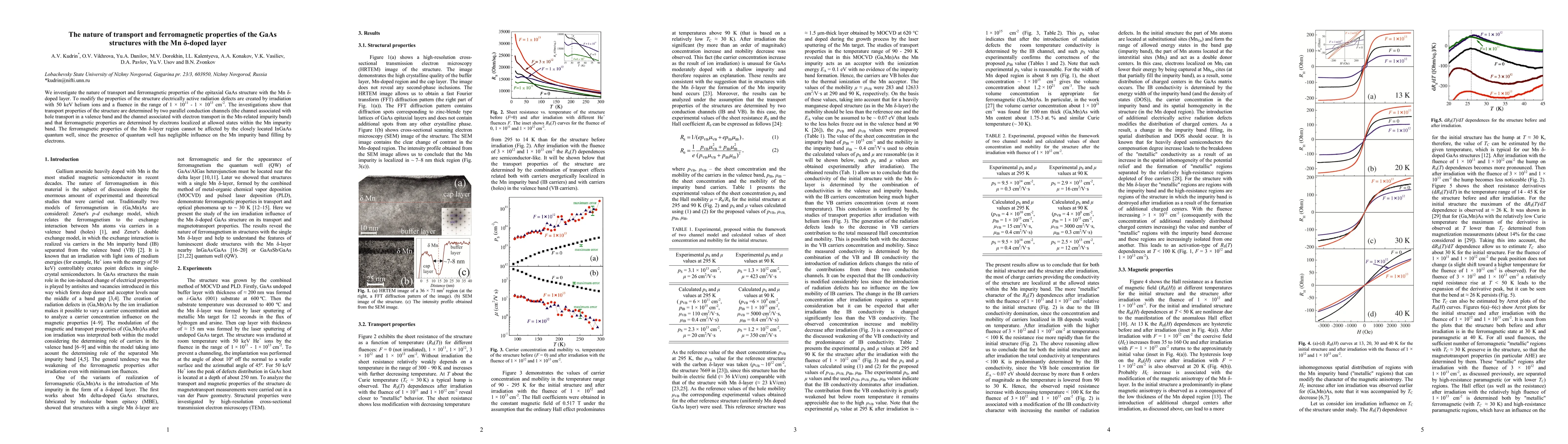 We reveal the nature of transport and ferromagnetic properties of the GaAs structure with the single Mn {\delta}-doped layer. To modify the properties of the structure the electrically active radiation defects are created by irradiation with helium ions. The investigations show that the transport properties of the structure are determined by two parallel conduction channels (the channel associated with hole transport in the valence band and the channel associated with electron transport in the Mn impurity band) and that the ferromagnetic properties are determined by the electrons localized at the allowed states within the Mn impurity band. The results also help to understand the features of structures with the Mn {\delta}-layer nearby the quantum well.