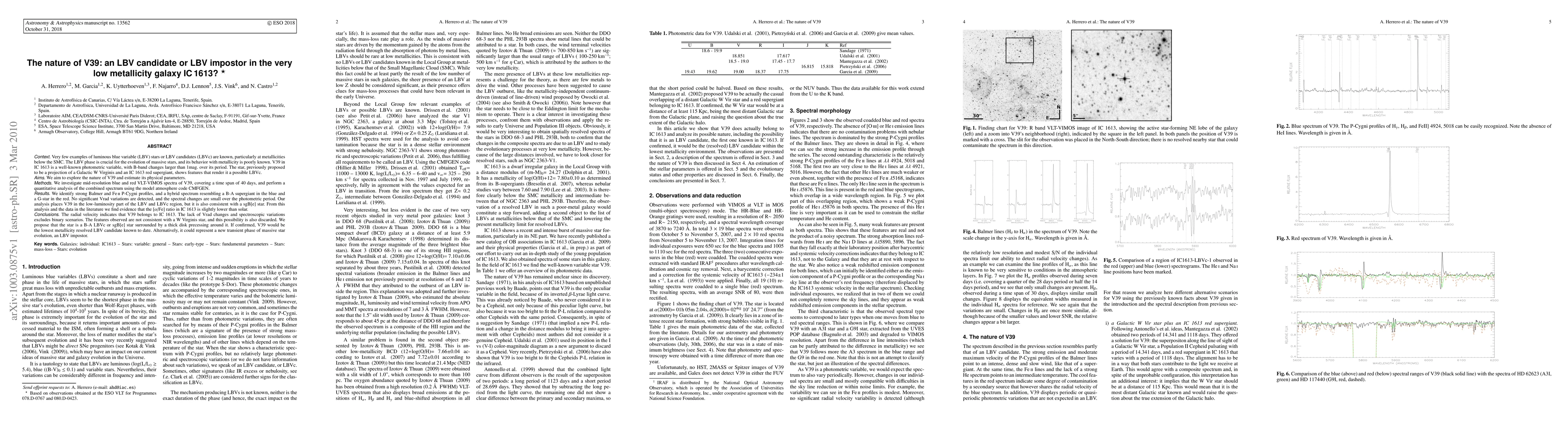 [abridged] Context: Very few examples of luminous blue variable (LBV) stars or LBV candidates (LBVc) are known, particularly at metallicities below the SMC. The LBV phase is crucial for the evolution of massive stars, and its behavior with metallicity is poorly known. V39 in IC 1613 is a well-known photometric variable, with B-band changes larger than 1mag. over its period. The star, previously proposed to be a projection of a Galactic W Virginis and an IC 1613 red supergiant, shows features that render it a possible LBVc. Method: We investigate mid-resolution blue and red VLT-VIMOS spectra of V39, covering a time span of 40 days, and perform a quantitative analysis of the combined spectrum using the model atmosphere code CMFGEN. Results: We identify strong Balmer and FeII P-Cygni profiles, and a hybrid spectrum resembling a B-A supergiant in the blue and a G-star in the red. No significant Vrad variations are detected, and the spectral changes are small over the photometric period. Our analysis places V39 in the low-luminosity part of the LBV and LBVc region, but it is also consistent with a sgB[e] star. Conclusions: The radial velocity indicates that V39 belongs to IC 1613. The lack of Vrad changes and spectroscopic variations excludes binary scenarios. The features observed are not consistent with a W Virginis star, and this possibility is also discarded. We propose that the star is a B-A LBVc or sgB[e] star surrounded by a thick disk precessing around it. If confirmed, V39 would be the lowest metallicity resolved LBV candidate known to date. Alternatively, it could represent a new transient phase of massive star evolution, an LBV impostor.