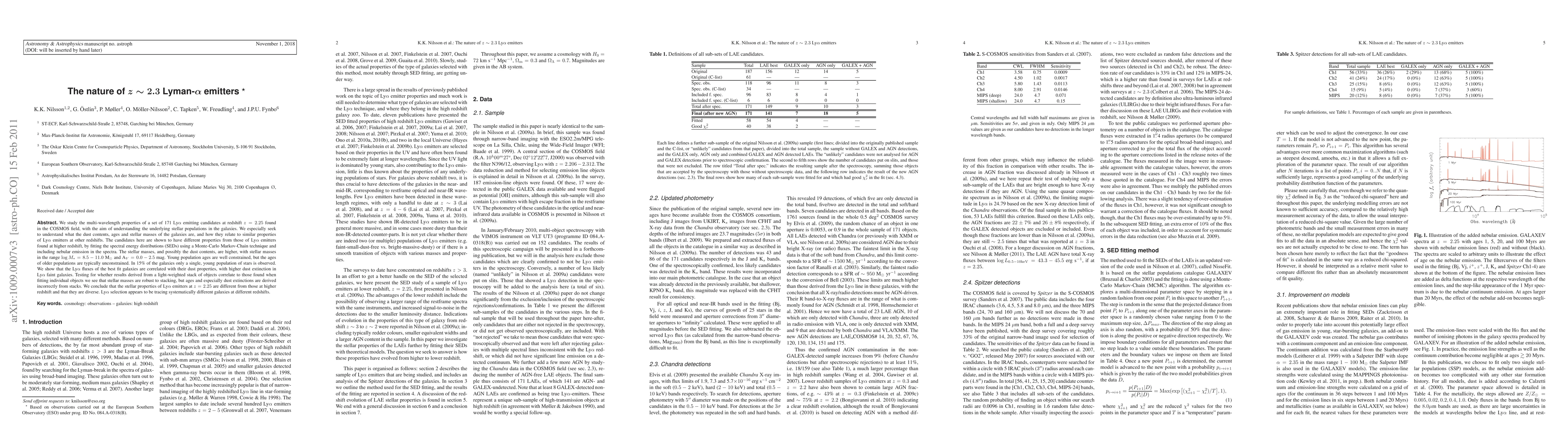 We study the multi-wavelength properties of a set of 171 Ly-alpha emitting candidates at redshift z = 2.25 found in the COSMOS field, with the aim of understanding the underlying stellar populations in the galaxies. We especially seek to understand what the dust contents, ages and stellar masses of the galaxies are, and how they relate to similar properties of Ly-alpha emitters at other redshifts. The candidates here are shown to have different properties from those of Ly-alpha emitters found at higher redshift, by fitting the spectral energy distributions (SEDs) using a Monte-Carlo Markov-Chain technique and including nebular emission in the spectra. The stellar masses, and possibly the dust contents, are higher, with stellar masses in the range log M_* = 8.5 - 11.0 M_sun and A_V = 0.0 - 2.5 mag. Young population ages are well constrained, but the ages of older populations are typically unconstrained. In 15% of the galaxies only a single, young population of stars is observed. We show that the Ly-alpha fluxes of the best fit galaxies are correlated with their dust properties, with higher dust extinction in Ly-alpha faint galaxies. Testing for whether results derived from a light-weighted stack of objects correlate to those found when fitting individual objects we see that stellar masses are robust to stacking, but ages and especially dust extinctions are derived incorrectly from stacks. We conclude that the stellar properties of Ly-alpha emitters at z = 2.25 are different from those at higher redshift and that they are diverse. Ly-alpha selection appears to be tracing systematically different galaxies at different redshifts.