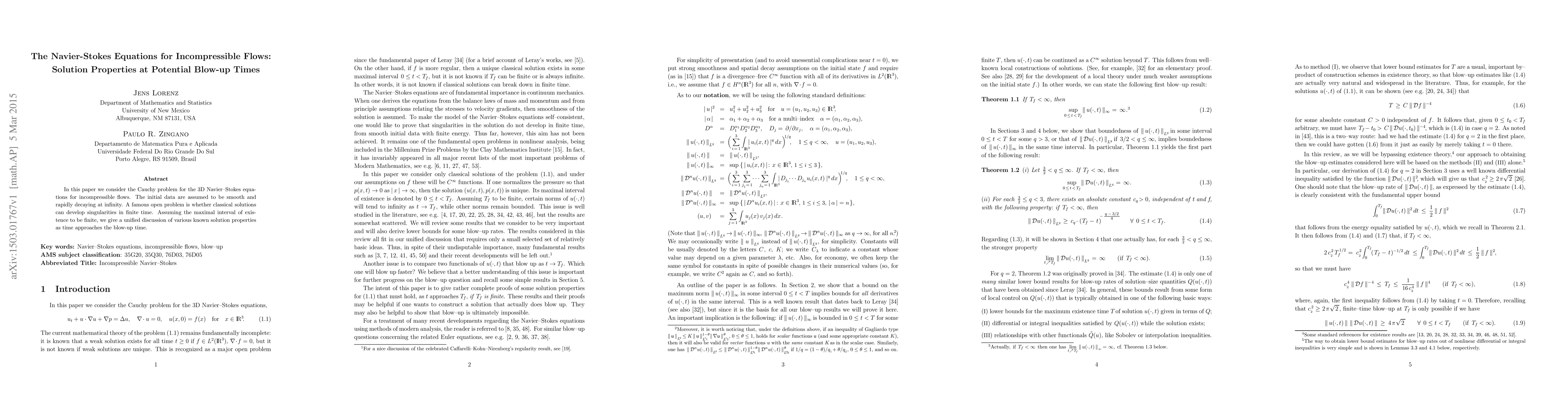 This paper examines the 3D Navier-Stokes equations for incompressible flows, focusing on the potential for classical solutions to develop singularities in finite time. It discusses known solution properties as time approaches the hypothetical blow-up time.
