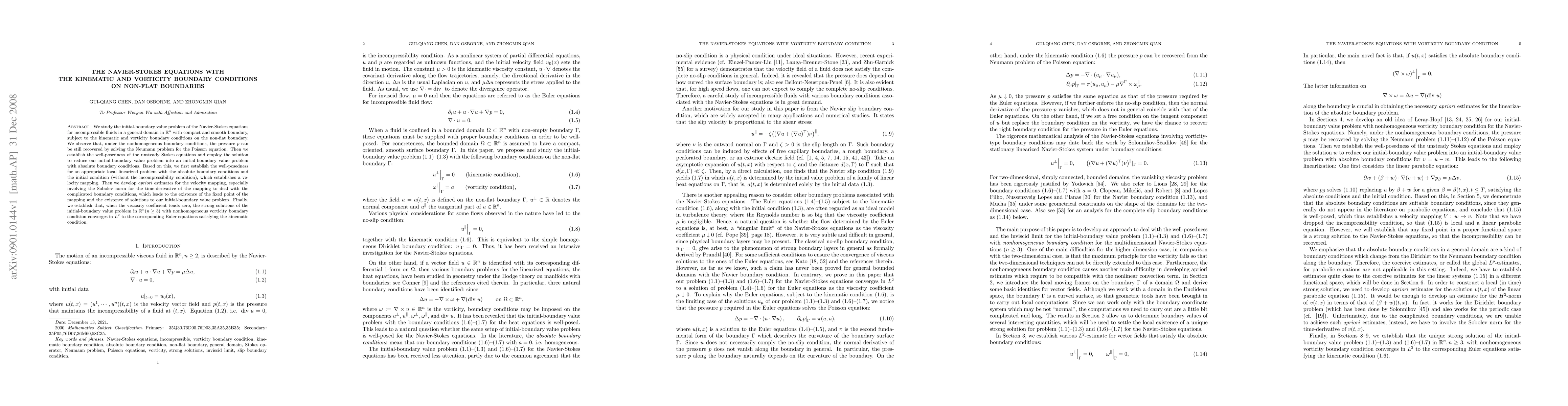 We study the initial-boundary value problem of the Navier-Stokes equations for incompressible fluids in a general domain in $\R^n$ with compact and smooth boundary, subject to the kinematic and vorticity boundary conditions on the non-flat boundary. We observe that, under the nonhomogeneous boundary conditions, the pressure $p$ can be still recovered by solving the Neumann problem for the Poisson equation. Then we establish the well-posedness of the unsteady Stokes equations and employ the solution to reduce our initial-boundary value problem into an initial-boundary value problem with absolute boundary conditions. Based on this, we first establish the well-posedness for an appropriate local linearized problem with the absolute boundary conditions and the initial condition (without the incompressibility condition), which establishes a velocity mapping. Then we develop \emph{apriori} estimates for the velocity mapping, especially involving the Sobolev norm for the time-derivative of the mapping to deal with the complicated boundary conditions, which leads to the existence of the fixed point of the mapping and the existence of solutions to our initial-boundary value problem. Finally, we establish that, when the viscosity coefficient tends zero, the strong solutions of the initial-boundary value problem in $\R^n (n\ge 3)$ with nonhomogeneous vorticity boundary condition converges in $L^2$ to the corresponding Euler equations satisfying the kinematic condition.