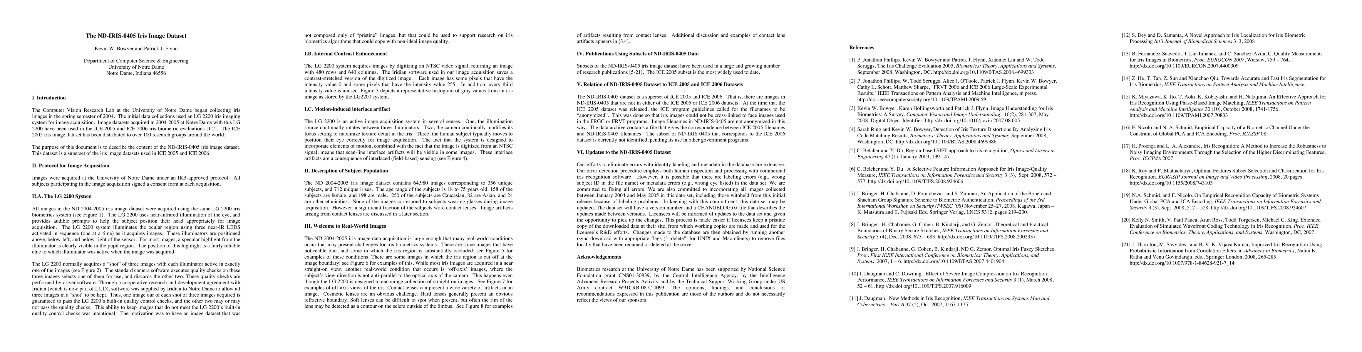 The Computer Vision Research Lab at the University of Notre Dame began collecting iris images in the spring semester of 2004. The initial data collections used an LG 2200 iris imaging system for image acquisition. Image datasets acquired in 2004-2005 at Notre Dame with this LG 2200 have been used in the ICE 2005 and ICE 2006 iris biometric evaluations. The ICE 2005 iris image dataset has been distributed to over 100 research groups around the world. The purpose of this document is to describe the content of the ND-IRIS-0405 iris image dataset. This dataset is a superset of the iris image datasets used in ICE 2005 and ICE 2006. The ND 2004-2005 iris image dataset contains 64,980 images corresponding to 356 unique subjects, and 712 unique irises. The age range of the subjects is 18 to 75 years old. 158 of the subjects are female, and 198 are male. 250 of the subjects are Caucasian, 82 are Asian, and 24 are other ethnicities.
