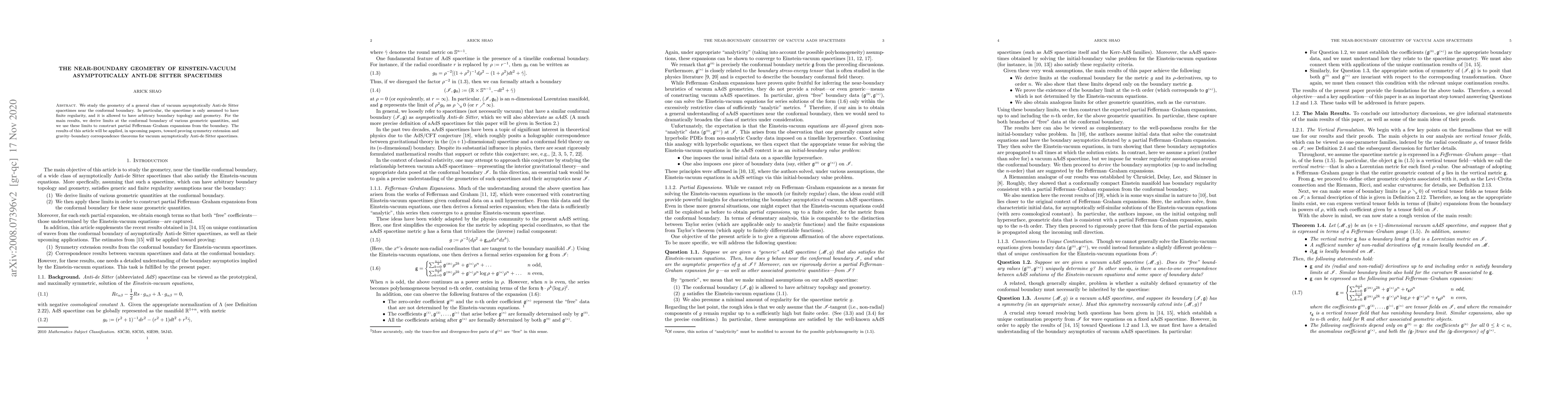 This paper investigates the geometry of vacuum asymptotically Anti-de Sitter spacetimes near their conformal boundary, focusing on finite regularity and arbitrary boundary topology. It derives boundary limits of geometric quantities and constructs partial Fefferman--Graham expansions, laying groundwork for future symmetry extension and gravity-boundary correspondence theorems.