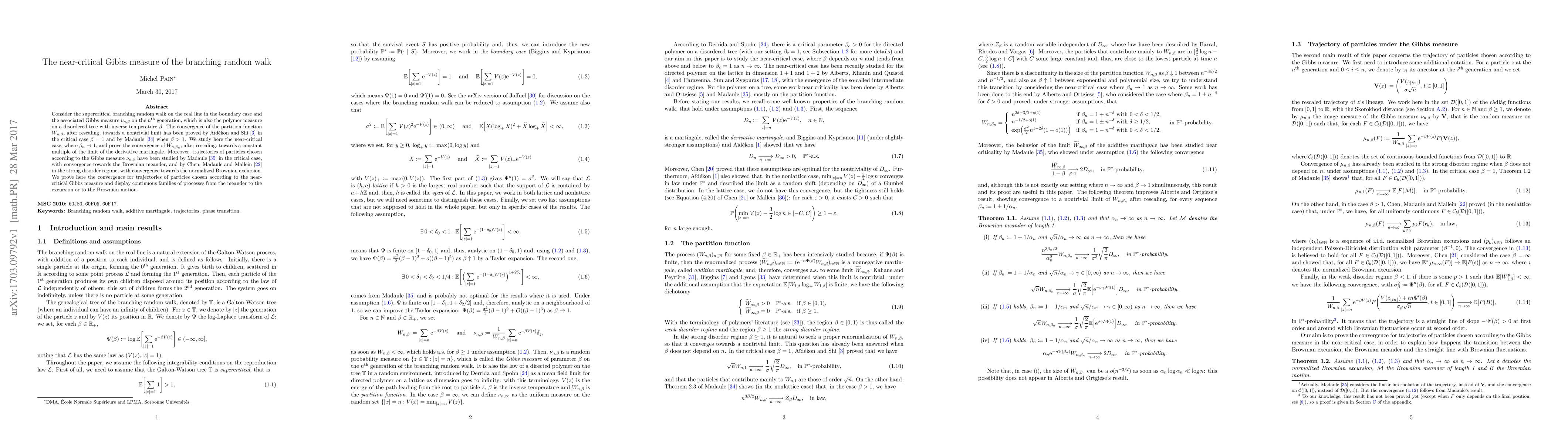 The work extends existing results on the critical and supercritical cases to the near-critical regime, providing new insights into the behavior of branching random walks and their associated Gibbs measures.