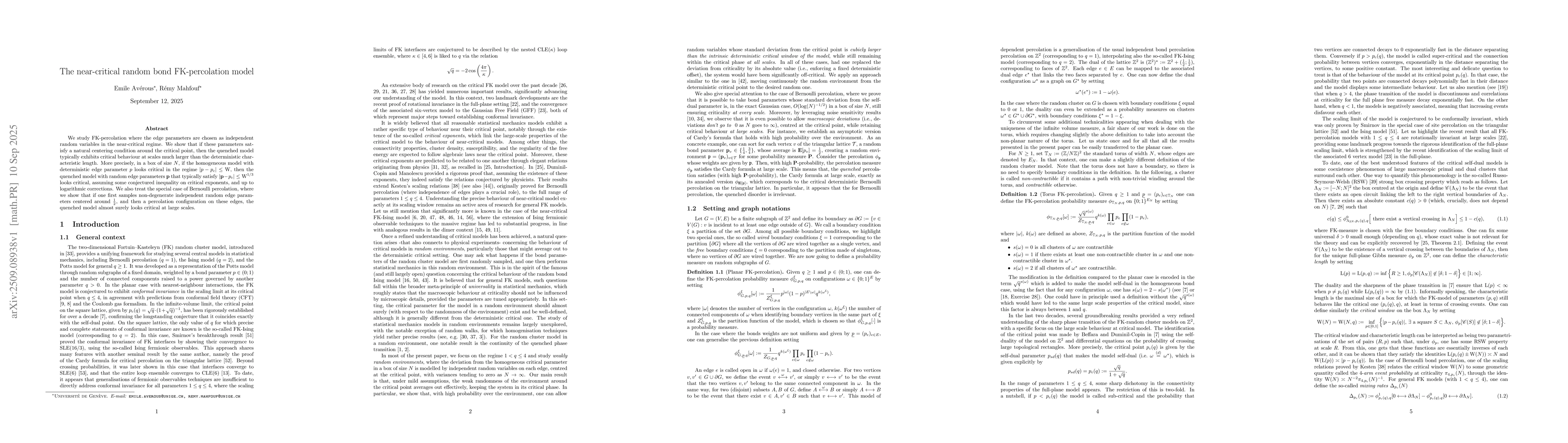 We study FK-percolation where the edge parameters are chosen as independent random variables in the near-critical regime. We show that if these parameters satisfy a natural centering condition around the critical point, then the quenched model typically exhibits critical behaviour at scales much larger than the deterministic characteristic length. More precisely, in a box of size $N$, if the homogeneous model with deterministic edge parameter $p$ looks critical in the regime $|p-p_c|\le \textrm W$, then the quenched model with random edge parameters $\mathbf p$ that typically satisfy $|\mathbf p-p_c|\le \textrm W^{1/3}$ looks critical, assuming some conjectured inequality on critical exponents, and up to logarithmic corrections. We also treat the special case of Bernoulli percolation, where we show that if one first samples non-degenerate independent random edge parameters centered around $\frac12$, and then a percolation configuration on these edges, the quenched model almost surely looks critical at large scales.