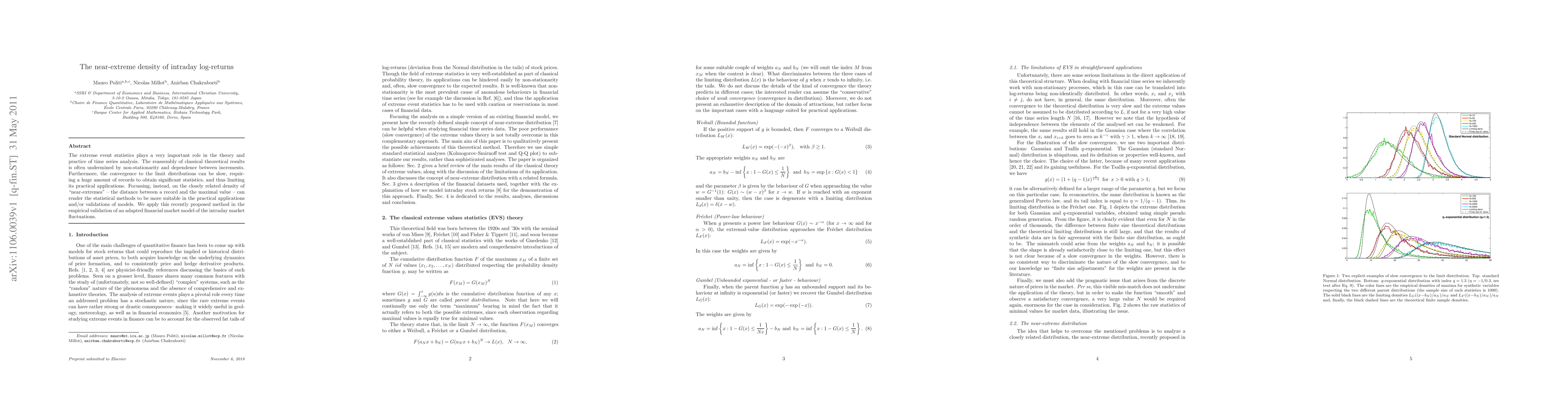 The extreme event statistics plays a very important role in the theory and practice of time series analysis. The reassembly of classical theoretical results is often undermined by non-stationarity and dependence between increments. Furthermore, the convergence to the limit distributions can be slow, requiring a huge amount of records to obtain significant statistics, and thus limiting its practical applications. Focussing, instead, on the closely related density of "near-extremes" -- the distance between a record and the maximal value -- can render the statistical methods to be more suitable in the practical applications and/or validations of models. We apply this recently proposed method in the empirical validation of an adapted financial market model of the intraday market fluctuations.