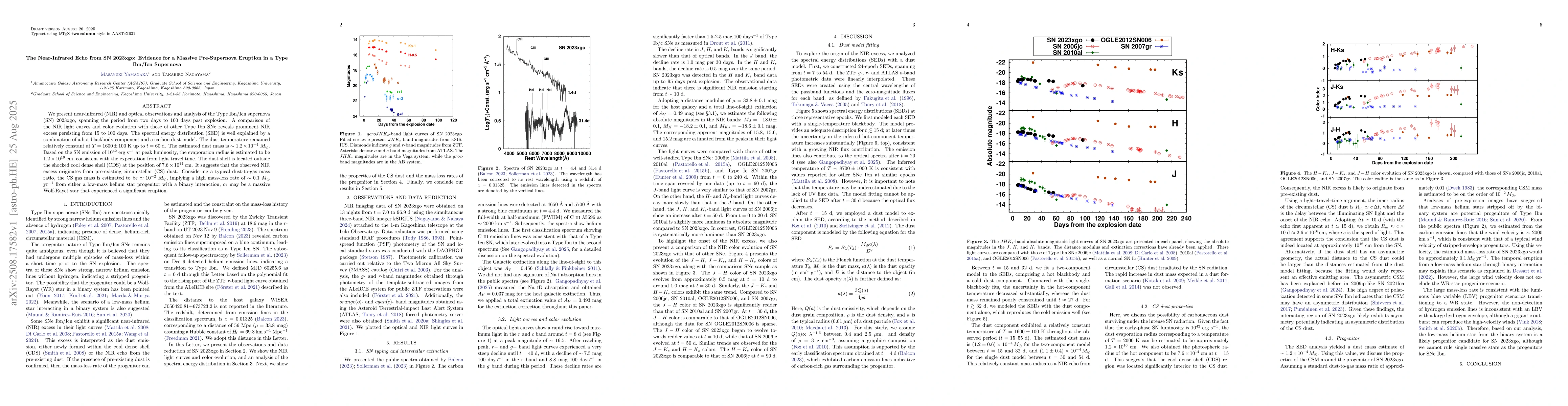 We present near-infrared (NIR) and optical observations and analysis of the Type Ibn/Icn supernova (SN) 2023xgo, spanning the period from two days to 100 days past explosion. A comparison of the NIR light curves and color evolution with those of other Type Ibn SNe reveals prominent NIR excess persisting from 15 to 100 days. The spectral energy distribution (SED) is well explained by a combination of a hot blackbody component and a carbon dust model. The dust temperature remained relatively constant at $T=1600\pm100$ K up to $t=60$ d. The estimated dust mass is $\sim1.2 \times10^{-4}~M_{\odot}$. Based on the SN emission of $10^{42}$ erg s$^{-1}$ at peak luminosity, the evaporation radius is estimated to be $1.2\times10^{16}$ cm, consistent with the expectation from light travel time. The dust shell is located outside the shocked cool dense shell (CDS) at the position of $7.6\times10^{14}$ cm. It suggests that the observed NIR excess originates from pre-existing circumstellar (CS) dust. Considering a typical dust-to-gas mass ratio, the CS gas mass is estimated to be $\simeq10^{-2}~M_{\odot}$, implying a high mass-loss rate of $\sim0.1~M_{\odot}$ yr$^{-1}$ from either a low-mass helium star progenitor with a binary interaction, or may be a massive Wolf-Rayet star that experienced a significant eruption.
