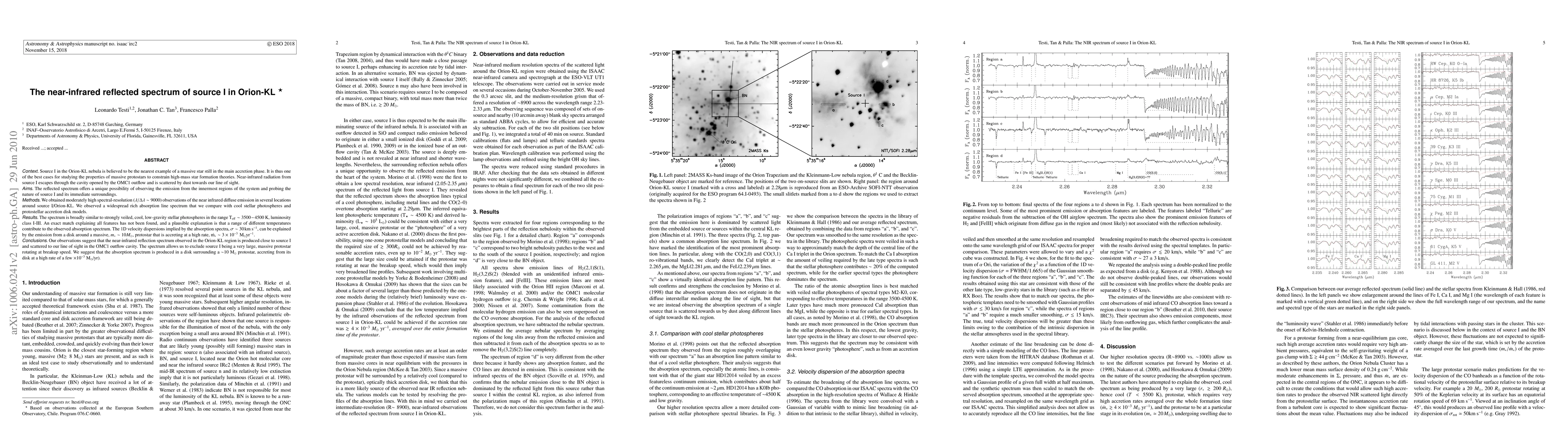 This paper analyzes the near-infrared reflected spectrum of Source I in Orion-KL, revealing a rich absorption line spectrum similar to cool stellar photospheres. The observations suggest Source I is a ~10 Msun protostar accreting at a high rate, with the spectrum indicating it is not a very large, rapidly rotating protostar.