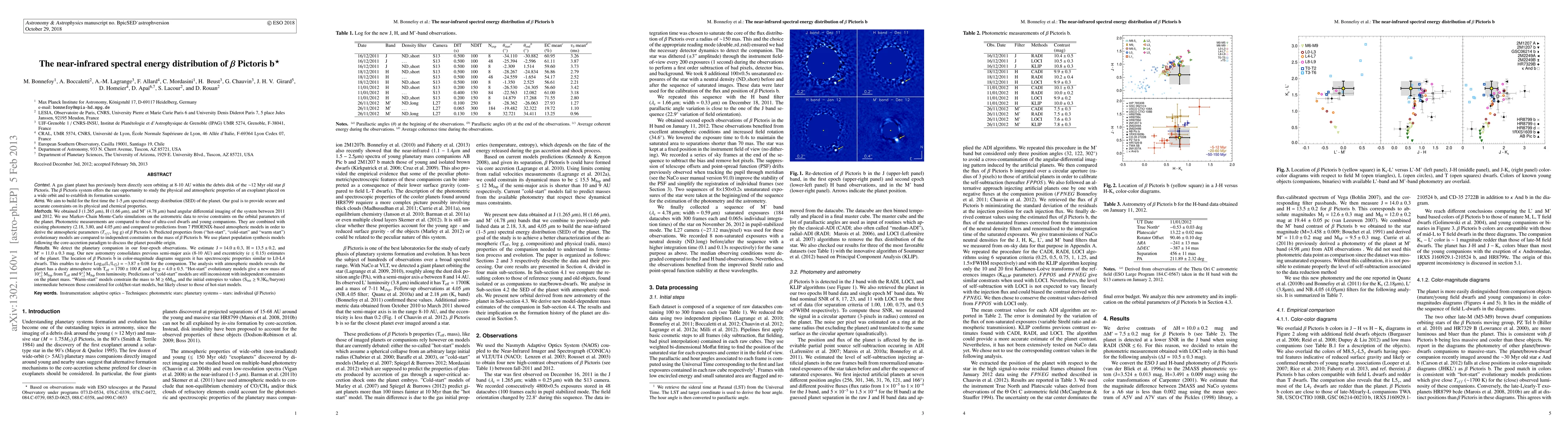 A gas giant planet has previously been directly seen orbiting at 8-10 AU within the debris disk of the ~12 Myr old star {\beta} Pictoris. The {\beta} Pictoris system offers the rare opportunity to study the physical and atmospheric properties of an exoplanet placed on a wide orbit and to establish its formation scenario. We obtained J (1.265 {\mu}m), H (1.66 {\mu}m), and M' (4.78 {\mu}m) band angular differential imaging of the system between 2011 and 2012. We detect the planetary companion in our four-epoch observations. We estimate J = 14.0 +- 0.3, H = 13.5 +- 0.2, and M' = 11.0 +- 0.3 mag. Our new astrometry consolidates previous semi-major axis (sma=8-10 AU) and excentricity (e <= 0.15) estimates of the planet. These constraints, and those derived from radial velocities of the star provides independent upper limits on the mass of {\beta} Pictoris b of 12 and 15.5 MJup for semi-major axis of 9 and 10 AU. The location of {\beta} Pictoris b in color-magnitude diagrams suggests it has spectroscopic properties similar to L0-L4 dwarfs. This enables to derive Log10(L/Lsun) = -3.87 +- 0.08 for the companion. The analysis with 7 PHOENIX-based atmospheric models reveals the planet has a dusty atmosphere with Teff = 1700 +- 100 K and log g = 4.0+- 0.5. "Hot-start" evolutionary models give a new mass of 10+3-2 MJup from Teff and 9+3-2 MJup from luminosity. Predictions of "cold-start" models are inconsistent with independent constraints on the planet mass. "Warm-start" models constrain the mass to M >= 6MJup and the initial entropies to values (Sinit >= 9.3Kb/baryon), intermediate between those considered for cold/hot-start models, but likely closer to those of hot-start models.