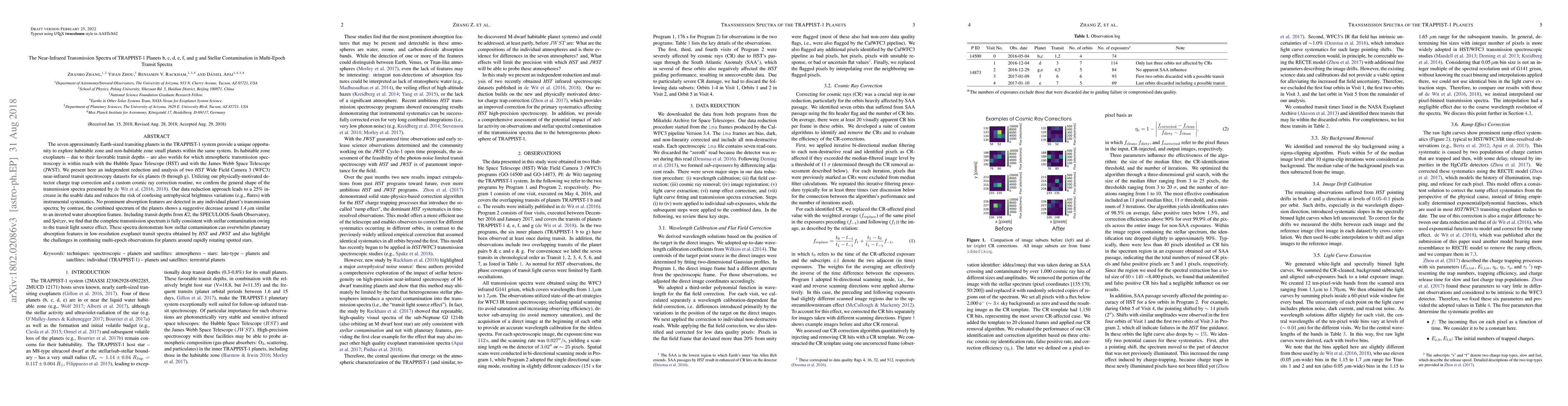This paper analyzes near-infrared transmission spectra of TRAPPIST-1 planets b through g using Hubble data, confirming the general shape of previous spectra but finding no prominent absorption features. The combined spectrum suggests a potential water feature, but stellar contamination likely masks true planetary signals.