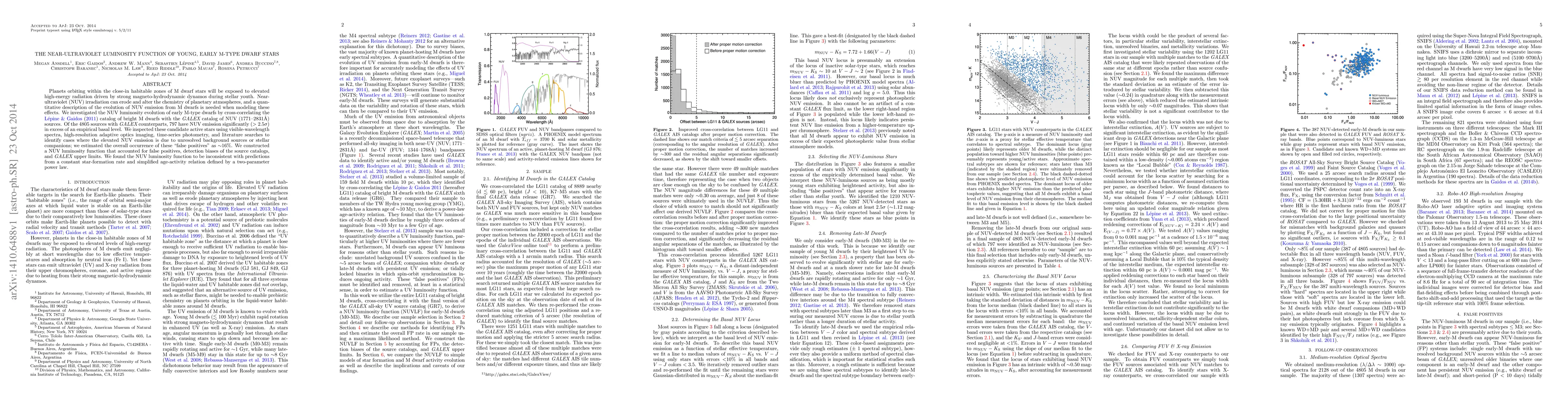 The research examines the near-ultraviolet (NUV) luminosity evolution of early M-type dwarf stars, crucial for understanding planetary atmosphere effects. Using GALEX and Lepine & Gaidos catalogs, they identified 797 active stars, accounting for false positives (~16%) and biases. The constructed NUV luminosity function contradicts predictions from constant star-formation and simplified age-activity relations.