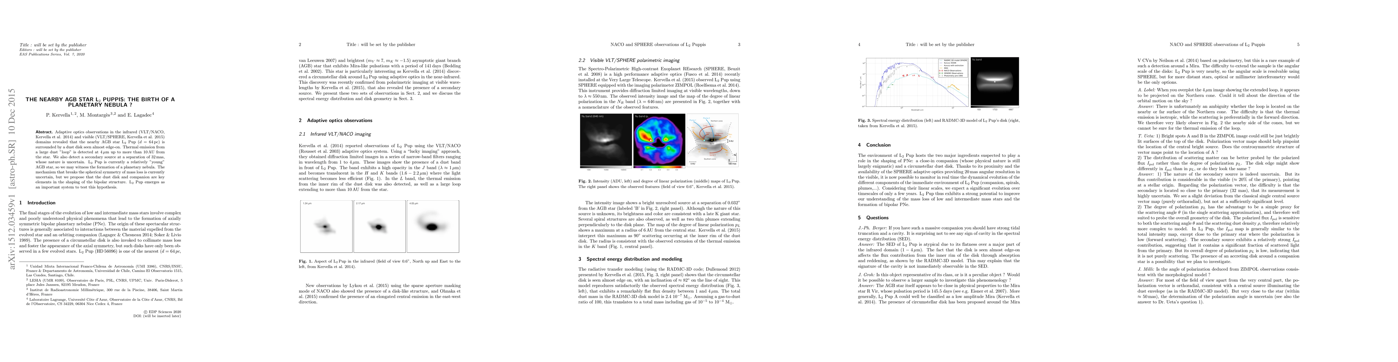 Adaptive optics observations in the infrared (VLT/NACO, Kervella et al. 2014) and visible (VLT/SPHERE, Kervella et al. 2015) domains revealed that the nearby AGB star L2 Pup (d=64 pc) is surrounded by a dust disk seen almost edge-on. Thermal emission from a large dust "loop" is detected at 4 microns up to more than 10 AU from the star. We also detect a secondary source at a separation of 32 mas, whose nature is uncertain. L2 Pup is currently a relatively "young" AGB star, so we may witness the formation of a planetary nebula. The mechanism that breaks the spherical symmetry of mass loss is currently uncertain, but we propose that the dust disk and companion are key elements in the shaping of the bipolar structure. L2 Pup emerges as an important system to test this hypothesis.