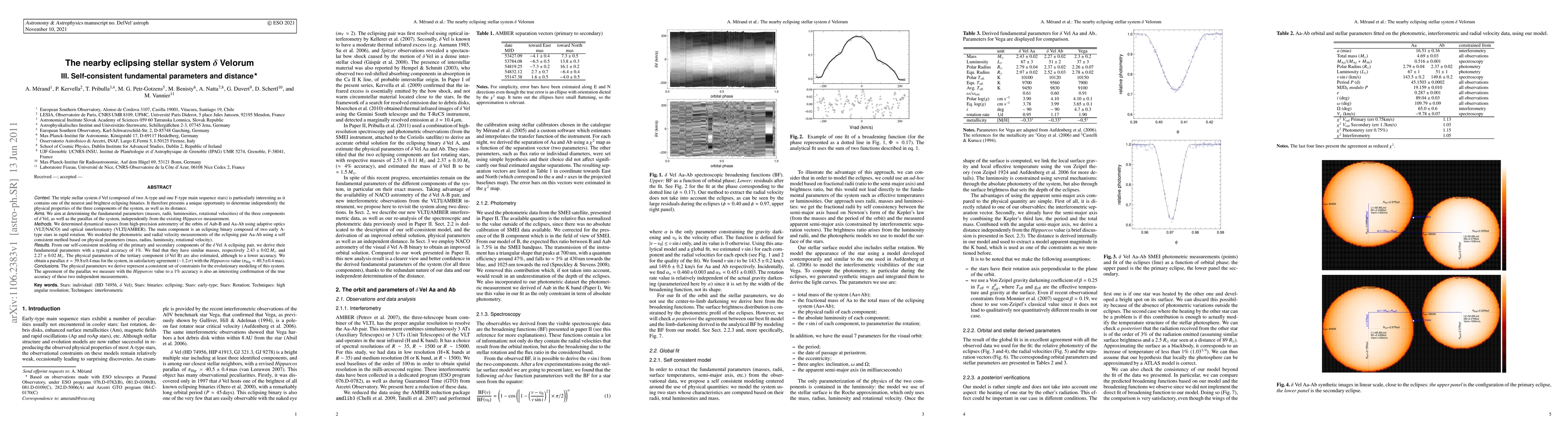 The triple stellar system delta Vel (composed of two A-type and one F-type main sequence stars) is particularly interesting as it contains one of the nearest and brightest eclipsing binaries. It therefore presents a unique opportunity to determine independently the physical properties of the three components of the system, as well as its distance. We aim at determining the fundamental parameters (masses, radii, luminosities, rotational velocities) of the three components of delta Vel, as well as the parallax of the system, independently from the existing Hipparcos} measurement. We determined dynamical masses from high-precision astrometry of the orbits of Aab-B and Aa-Ab using adaptive optics (VLT/NACO) and optical interferometry (VLTI/AMBER). The main component is an eclipsing binary composed of two early A-type stars in rapid rotation. We modeled the photometric and radial velocity measurements of the eclipsing pair Aa-Ab using a self consistent method based on physical parameters (mass, radius, luminosity, rotational velocity). From our self-consistent modeling of the primary and secondary components of the delta Vel A eclipsing pair, we derive their fundamental parameters with a typical accuracy of 1%. We find that they have similar masses, respectively 2.43+/-0.02Msol and 2.27+/-0.02Msol. The physical parameters of the tertiary component (delta Vel B) are also estimated, although to a lower accuracy. We obtain a parallax of 39.8+/-0.4mas for the system, in satisfactory agreement (-1.2 sigma) with the Hipparcos value (40.5+/-0.4mas). The physical parameters we derive represent a consistent set of constraints for the evolutionary modeling of this system. The agreement of the parallax we measure with the Hipparcos value to a 1% accuracy is also an interesting confirmation of the true accuracy of these two independent measurements.