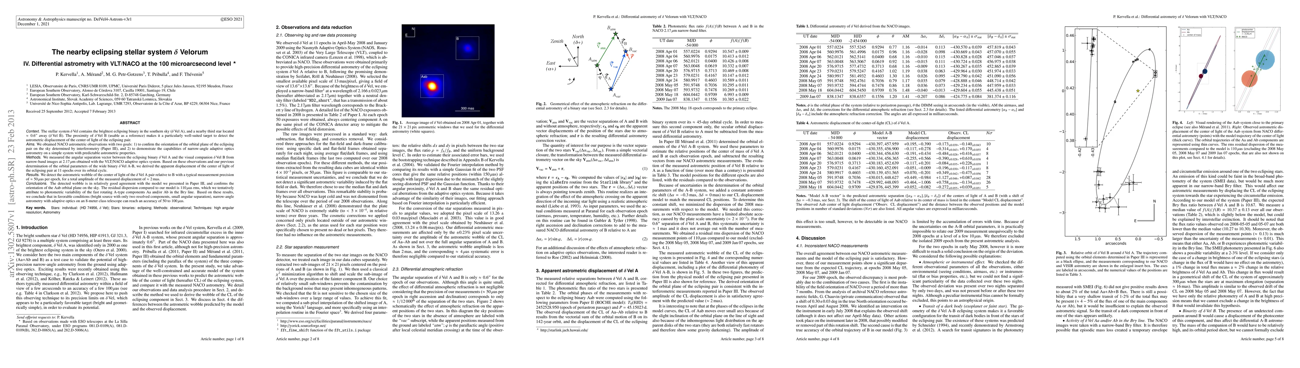 Context. delta Vel contains the brightest eclipsing binary in the southern sky (delta Vel A), and a nearby third star located ~0.6" away (delta Vel B). The proximity of delta Vel B (usable as a reference) makes it a particularly well-suited target to detect the astrometric displacement of the center of light of the eclipsing pair. Aims. We obtained NACO astrometric observations with two goals: (1) to confirm the orientation of the orbital plane of the eclipsing pair on the sky determined by interferometry (Paper III) and (2) demonstrate the capabilities of narrow-angle adaptive optics astrometry on a simple system with predictable astrometric properties. Methods. We measured the angular separation vector between the eclipsing binary delta Vel A and the visual companion delta Vel B from narrow-band images at 2.17 microns obtained with the VLT/NACO adaptive optics system. Based on these observations and our previous determination of the orbital parameters of the wide binary delta Vel A-B, we derive the apparent displacement of the center-of-light of the eclipsing pair at 11 epochs over its orbital cycle. Results. We detect the astrometric wobble of the center of light of the delta Vel A pair relatively to B with a typical measurement precision of ~50 microarcseconds per epoch, for a total amplitude of the measured displacement of ~2 milliarcseconds. Conclusions. The detected wobble is in agreement with our model presented in Paper III and confirms the orientation of the Aab orbital plane on the sky. The residual dispersion compared to our model is 110 microarcseconds rms, that we tentatively attribute to photometric variability of the fast rotating A-type components Aa and/or Ab in the BrGamma line. Based on these results, we conclude that in favorable conditions (bright source with only two resolved components, small angular separation), narrow-angle astrometry with adaptive optics on an 8-meter class telescope can reach an accuracy of 50 to 100 microarcseconds.