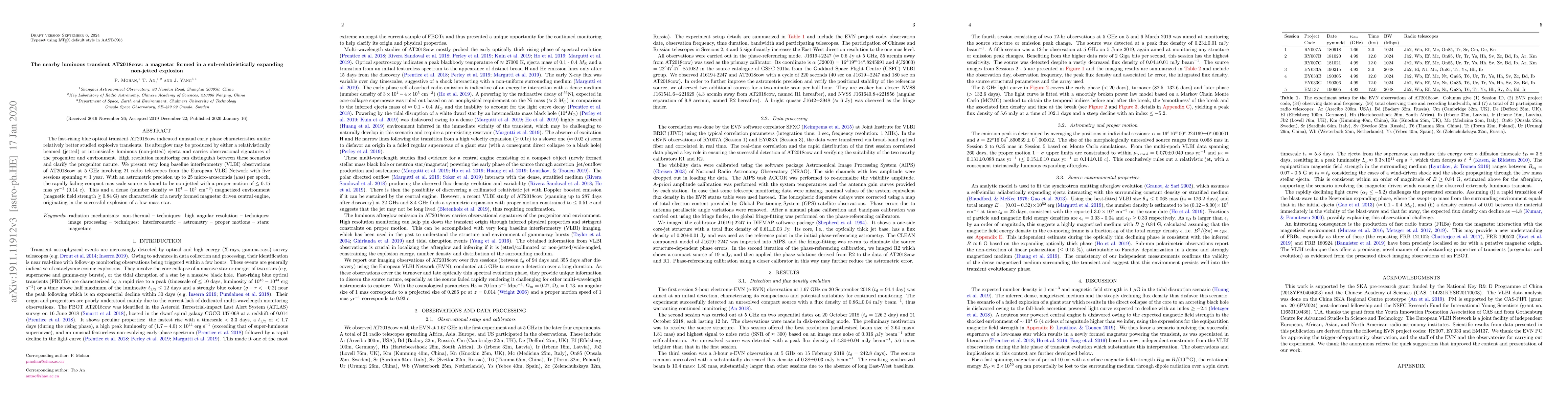 Summary: The transient AT2018cow, characterized by its rapid rise in blue optical light, suggests a non-jetted, sub-relativistic explosion likely driven by a newly formed magnetar. VLBI observations reveal a compact, fading source with a slow proper motion, indicating a dense magnetized environment consistent with a low-mass star explosion.