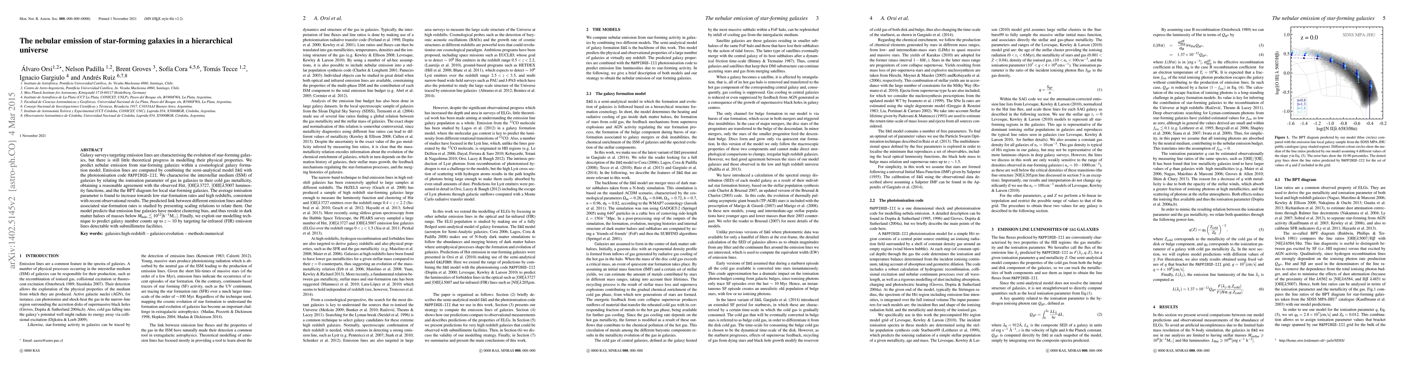 Galaxy surveys targeting emission lines are characterising the evolution of star-forming galaxies, but there is still little theoretical progress in modelling their physical properties. We predict nebular emission from star-forming galaxies within a cosmological galaxy formation model. Emission lines are computed by combining the semi-analytical model \sag\ with the photoionisation code \mapp. We characterise the interstellar medium (ISM) of galaxies by relating the ionisation parameter of gas in galaxies to their cold gas metallicity, obtaining a reasonable agreement with the observed \ha, \oii, \oiii\ luminosity functions, and the the BPT diagram for local star-forming galaxies. The average ionisation parameter is found to increase towards low star-formation rates and high redshifts, consistent with recent observational results. The predicted link between different emission lines and their associated star-formation rates is studied by presenting scaling relations to relate them. Our model predicts that emission line galaxies have modest clustering bias, and thus reside in dark matter haloes of masses below $M_{\rm halo} \lesssim 10^{12} {[\rm h^{-1} M_{\odot}]}$. Finally, we exploit our modelling technique to predict galaxy number counts up to $z\sim 10$ by targeting far-infrared (FIR) emission lines detectable with submillimetre facilities