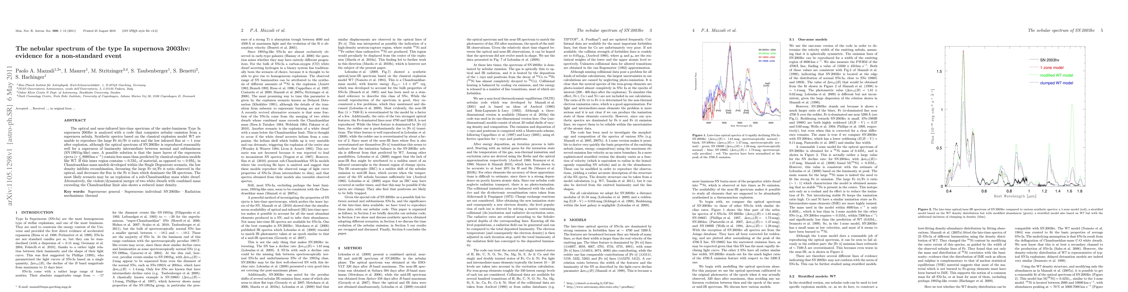 The optical and near-infrared late-time spectrum of the under-luminous Type Ia supernova 2003hv is analysed with a code that computes nebular emission from a supernova nebula. Synthetic spectra based on the classical explosion model W7 are unable to reproduce the large \FeIII/\FeII\ ratio and the low infrared flux at $\sim 1$ year after explosion, although the optical spectrum of SN\,2003hv is reproduced reasonably well for a supernova of luminosity intermediate between normal and subluminous (SN\,1991bg-like) ones. A possible solution is that the inner layers of the supernova ejecta ($v \lsim 8000$\,\kms) contain less mass than predicted by classical explosion models like W7. If this inner region contains $\sim 0.5 \Msun$ of material, as opposed to $\sim 0.9 \Msun$ in Chandrasekhar-mass models developed within the Single Degenerate scenario, the low density inhibits recombination, favouring the large \FeIII/\FeII\ ratio observed in the optical, and decreases the flux in the \FeII\ lines which dominate the IR spectrum. The most likely scenario may be an explosion of a sub-Chandrasekhar mass white dwarf. Alternatively, the violent/dynamical merger of two white dwarfs with combined mass exceeding the Chandrasekhar limit also shows a reduced inner density.