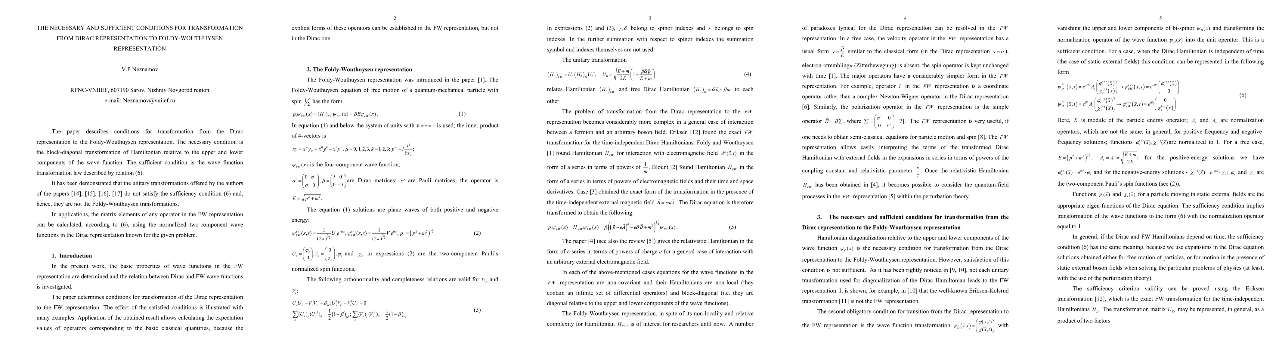 The paper identifies the necessary and sufficient conditions for transforming from the Dirac to the Foldy-Wouthuysen representation, showing that the necessary condition involves a block-diagonal Hamiltonian, while the sufficient condition is met by a specific wave function transformation law. It also critiques previous unitary transformations, asserting they do not meet the sufficiency condition.