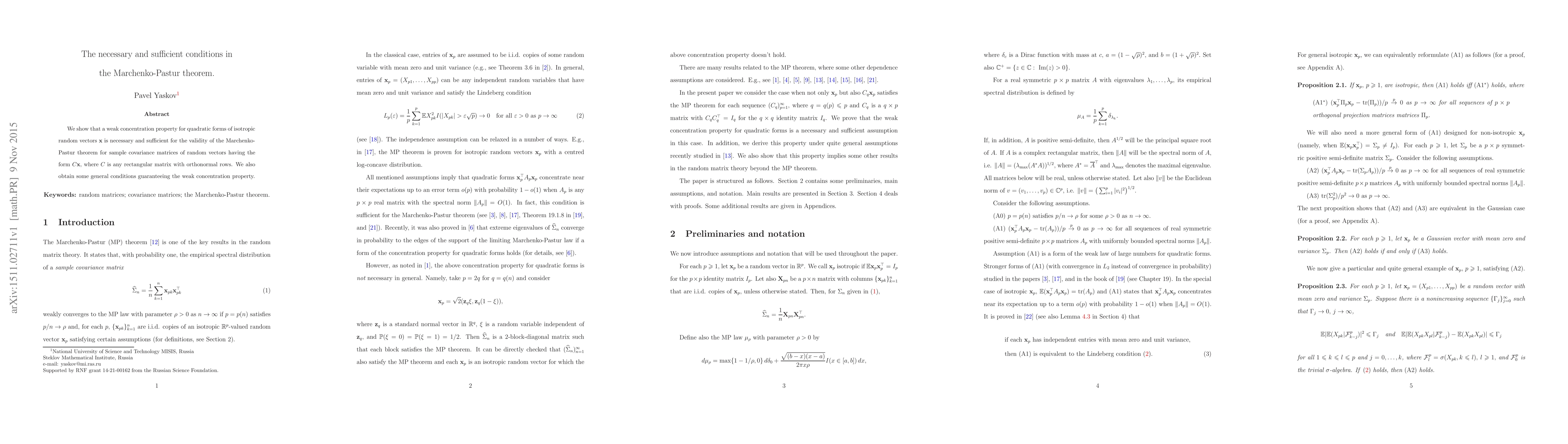 We show that a weak concentration property for quadratic forms of isotropic random vectors ${\bf x}$ is necessary and sufficient for the validity of the Marchenko-Pastur theorem for sample covariance matrices of random vectors having the form $C{\bf x}$, where $C$ is any rectangular matrix with orthonormal rows. We also obtain some general conditions guaranteeing the weak concentration property.