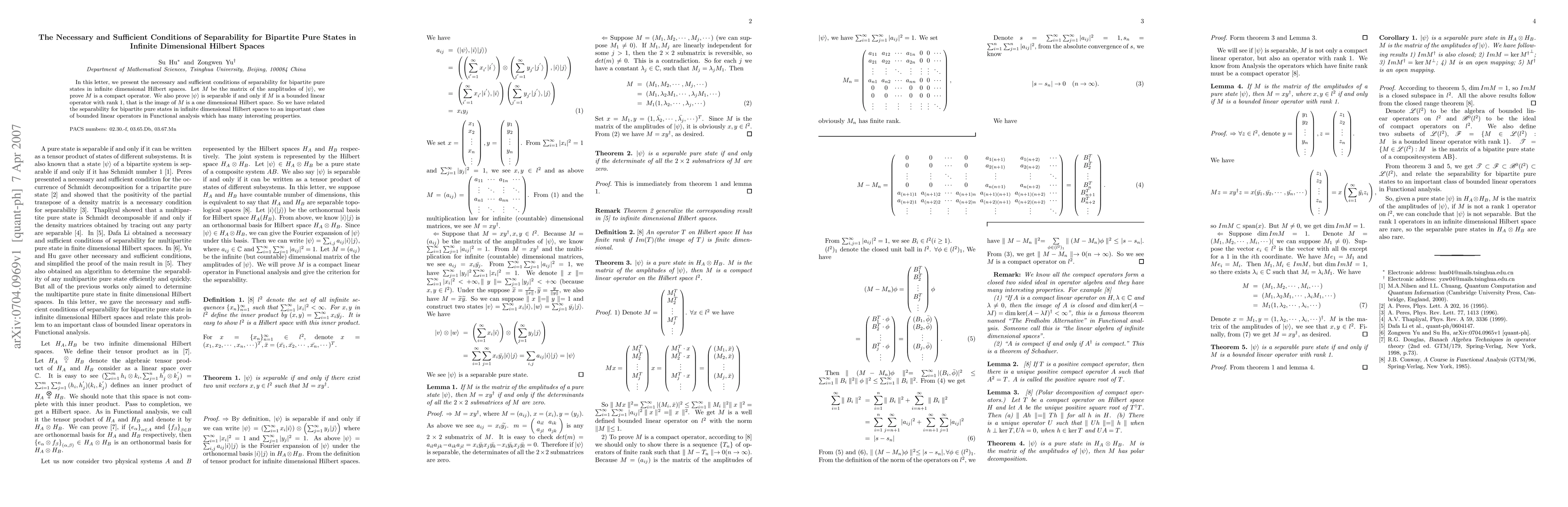 This paper establishes the necessary and sufficient conditions for separability of bipartite pure states in infinite-dimensional Hilbert spaces, proving that such states are separable if and only if the matrix of their amplitudes is a rank-1 bounded linear operator.