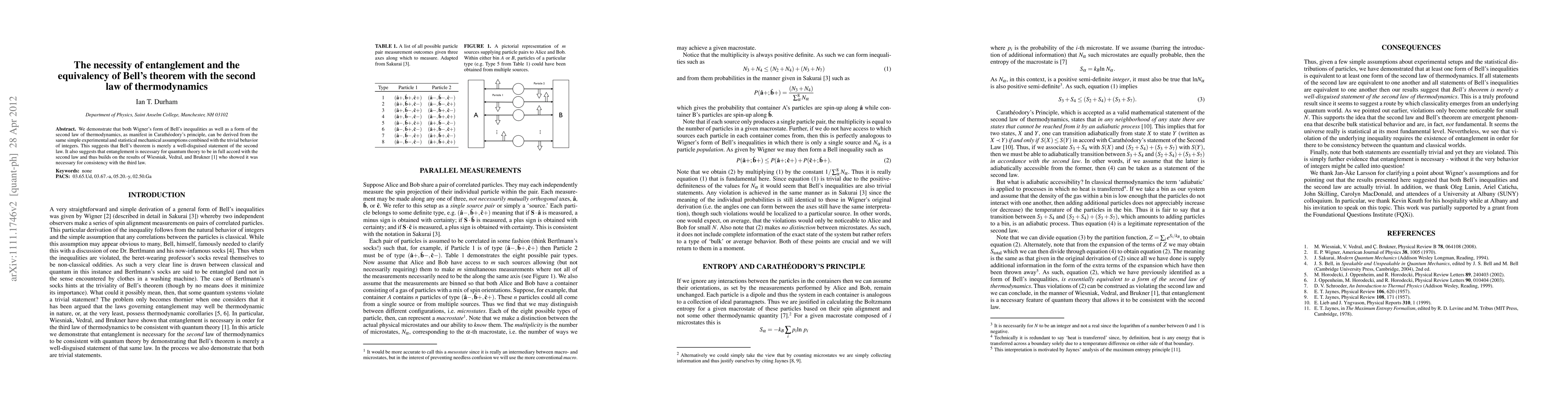 This research highlights the equivalency of Bell's theorem with the second law of thermodynamics, suggesting that entanglement is a fundamental aspect of quantum theory.