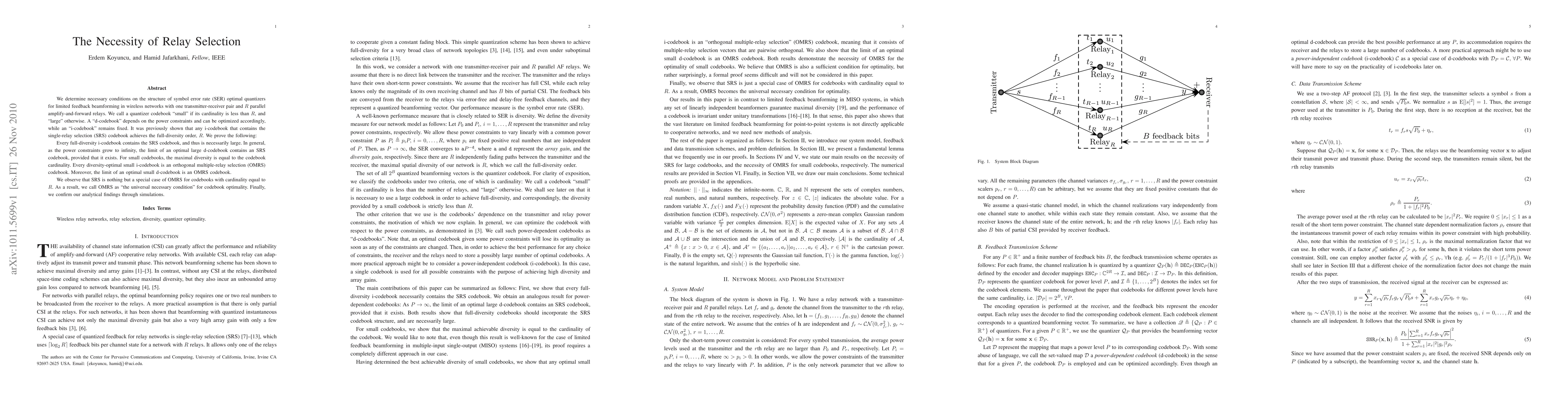 We determine necessary conditions on the structure of symbol error rate (SER) optimal quantizers for limited feedback beamforming in wireless networks with one transmitter-receiver pair and R parallel amplify-and-forward relays. We call a quantizer codebook "small" if its cardinality is less than R, and "large" otherwise. A "d-codebook" depends on the power constraints and can be optimized accordingly, while an "i-codebook" remains fixed. It was previously shown that any i-codebook that contains the single-relay selection (SRS) codebook achieves the full-diversity order, R. We prove the following: Every full-diversity i-codebook contains the SRS codebook, and thus is necessarily large. In general, as the power constraints grow to infinity, the limit of an optimal large d-codebook contains an SRS codebook, provided that it exists. For small codebooks, the maximal diversity is equal to the codebook cardinality. Every diversity-optimal small i-codebook is an orthogonal multiple-relay selection (OMRS) codebook. Moreover, the limit of an optimal small d-codebook is an OMRS codebook. We observe that SRS is nothing but a special case of OMRS for codebooks with cardinality equal to R. As a result, we call OMRS as "the universal necessary condition" for codebook optimality. Finally, we confirm our analytical findings through simulations.