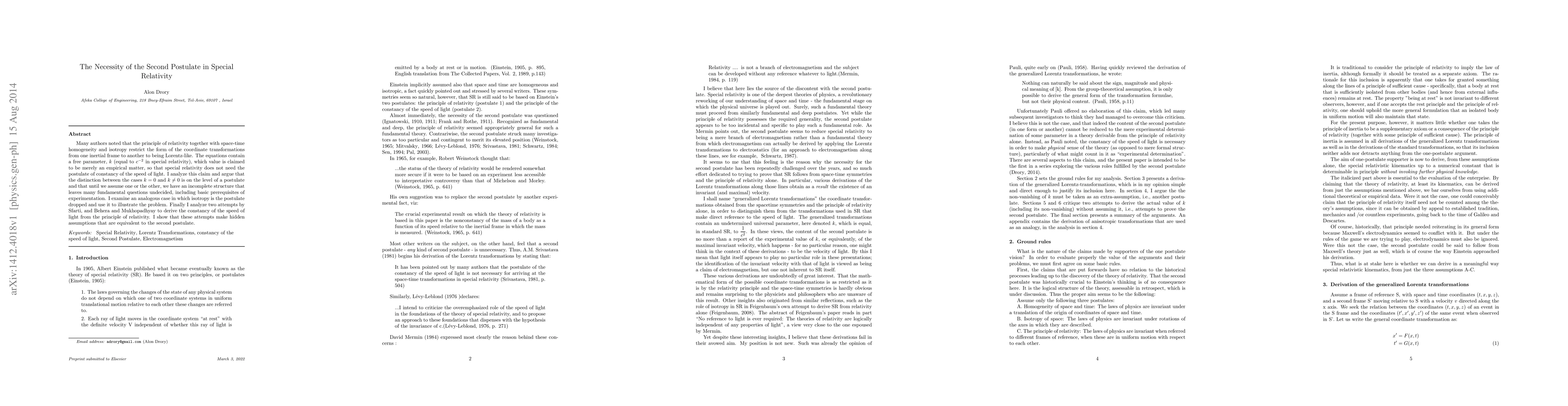 This paper argues that the second postulate of special relativity—the constancy of the speed of light—is essential, despite claims that it is merely empirical. The author contends that without this postulate, a complete framework for understanding fundamental physics remains incomplete.