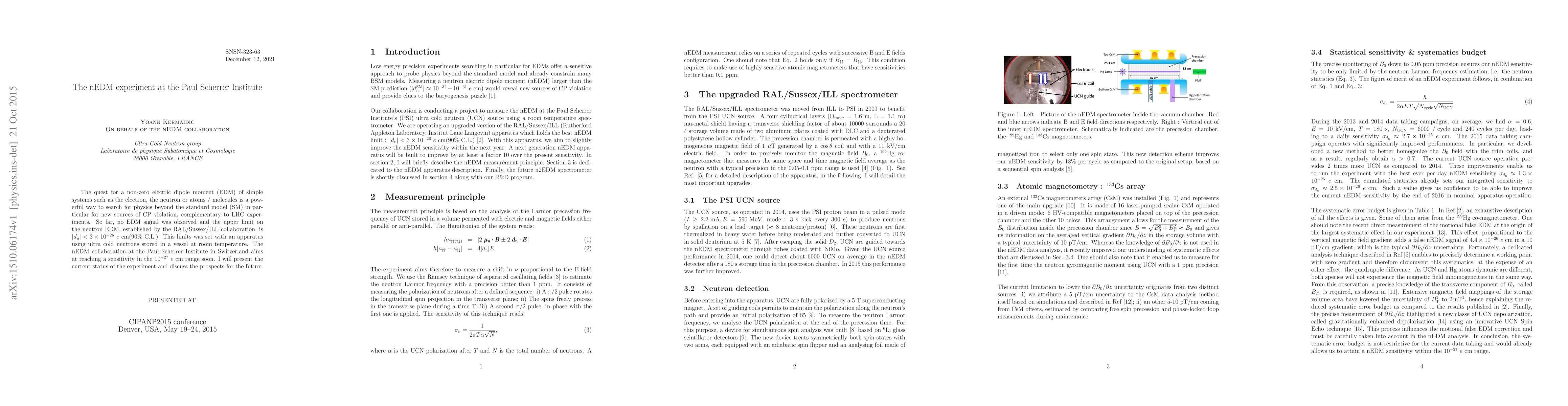 The nEDM experiment at the Paul Scherrer Institute aims to detect a non-zero electric dipole moment (EDM) in fundamental particles to search for physics beyond the standard model, particularly new sources of CP violation. The current goal is to improve sensitivity to reach a limit of 10^-27 e cm.