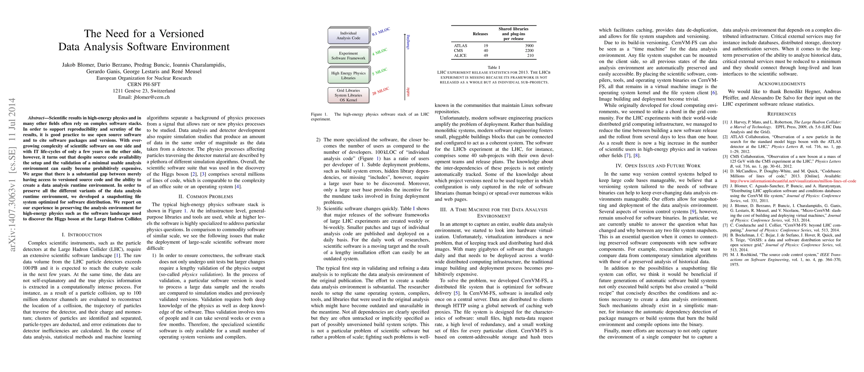 The paper discusses the challenges in creating reproducible data analysis environments due to complex software stacks and short IT lifecycles. It proposes a snapshotting file system to preserve different versions of analysis environments, demonstrating its application in high-energy physics.