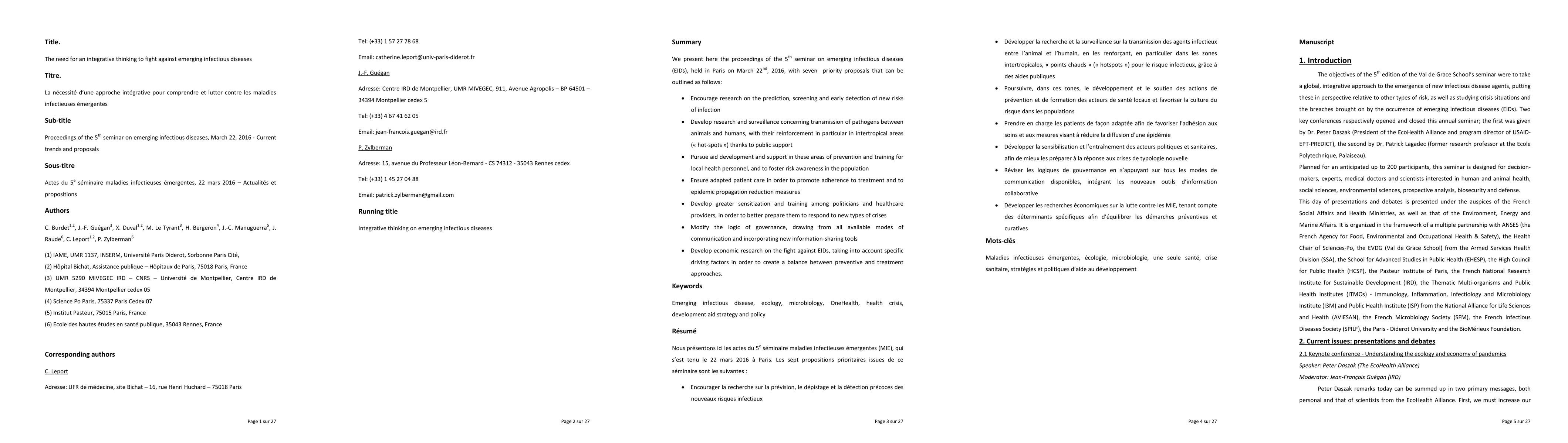 We present here the proceedings of the 5th seminar on emerging infectious diseases (EIDs), held in Paris on March 22nd, 2016, with seven priority proposals that can be outlined as follows:$\bullet$Encourage research on the prediction, screening and early detection of new risks of infection$\bullet$Develop research and surveillance concerning transmission of pathogens between animals and humans, with their reinforcement in particular in intertropical areas (`hot-spots') thanks to public support$\bullet$Pursue aid development and support in these areas of prevention and training for local health personnel, and to foster risk awareness in the population$\bullet$Ensure adapted patient care in order to promote adherence to treatment and to epidemic propagation reduction measures$\bullet$Develop greater sensitization and training among politicians and healthcare providers, in order to better prepare them to respond to new types of crises$\bullet$Modify the logic of governance, drawing from all available modes of communication and incorporating new information-sharing tools$\bullet$Develop economic research on the fight against EIDs, taking into account specific driving factors in order to create a balance between preventive and treatment approaches.