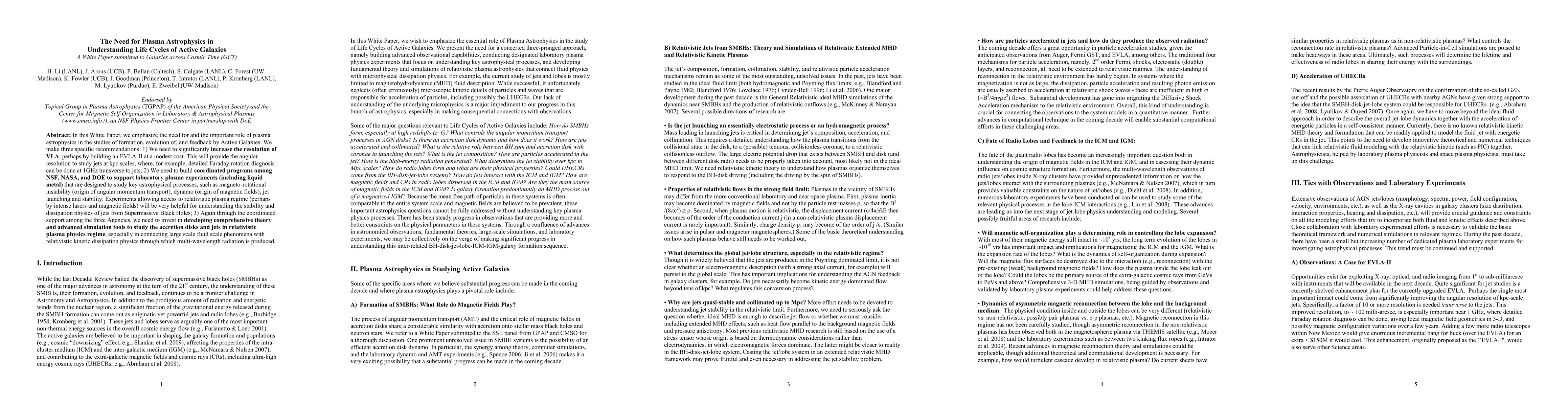 In this White Paper, we emphasize the need for and the important role of plasma astrophysics in the studies of formation, evolution of, and feedback by Active Galaxies. We make three specific recommendations: 1) We need to significantly increase the resolution of VLA, perhaps by building an EVLA-II at a modest cost. This will provide the angular resolution to study jets at kpc scales, where, for example, detailed Faraday rotation diagnosis can be done at 1GHz transverse to jets; 2) We need to build coordinated programs among NSF, NASA, and DOE to support laboratory plasma experiments (including liquid metal) that are designed to study key astrophysical processes, such as magneto-rotational instability (origin of angular momentum transport), dynamo (origin of magnetic fields), jet launching and stability. Experiments allowing access to relativistic plasma regime (perhaps by intense lasers and magnetic fields) will be very helpful for understanding the stability and dissipation physics of jets from Supermassive Black Holes; 3) Again through the coordinated support among the three Agencies, we need to invest in developing comprehensive theory and advanced simulation tools to study the accretion disks and jets in relativistic plasma physics regime, especially in connecting large scale fluid scale phenomena with relativistic kinetic dissipation physics through which multi-wavelength radiation is produced.