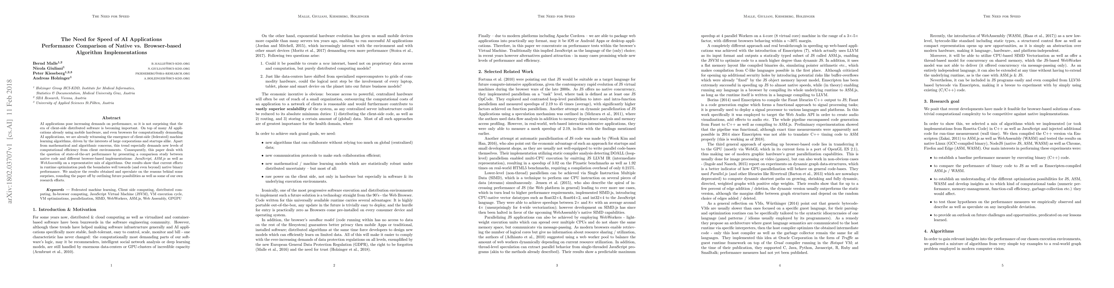This paper compares the performance of AI applications implemented in native code versus browser-based implementations like JavaScript, ASM.js, and WebAssembly. The findings indicate that runtime optimizations in browser-based implementations can achieve performance comparable to native binaries, highlighting the potential for efficient client-side distributed AI applications.